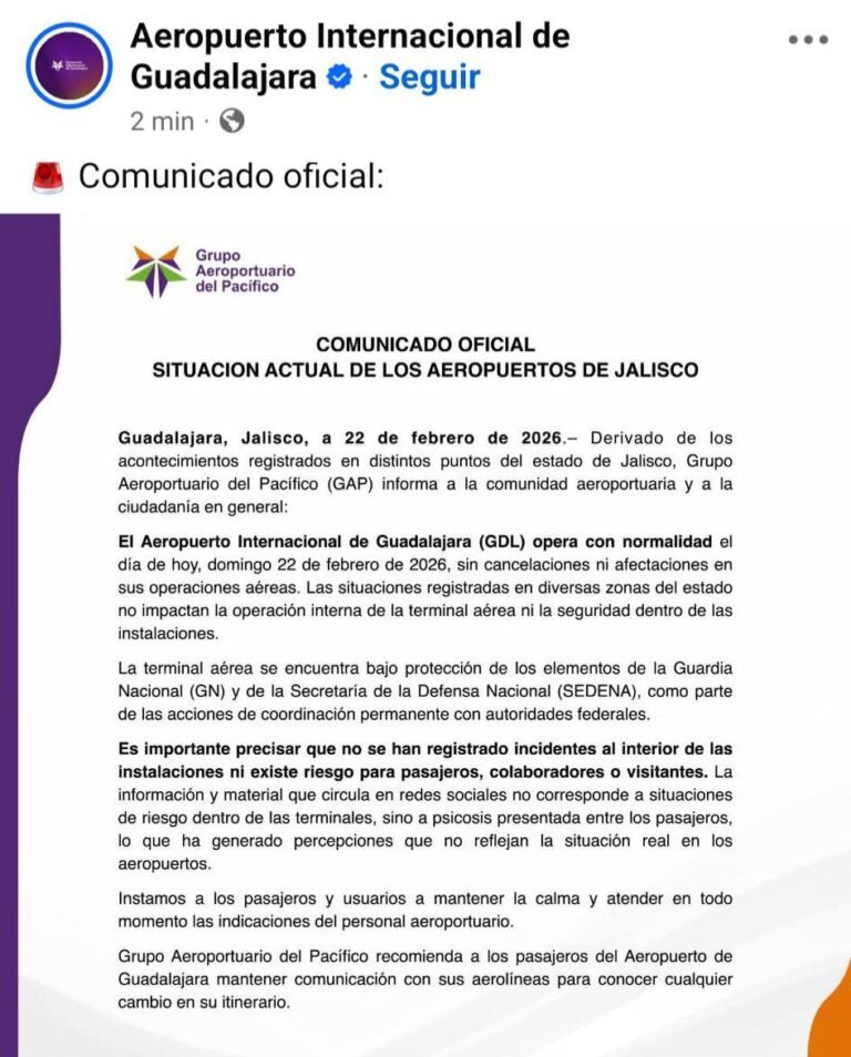 H. Cd. de Chihuahua.- El Aeropuerto Internacional de Guadalajara informó a través de un comunicado oficial que son falsas las imágenes y versiones que circulan en redes sociales sobre presuntos incidentes al interior de la terminal aérea. La administración aclaró que no se
