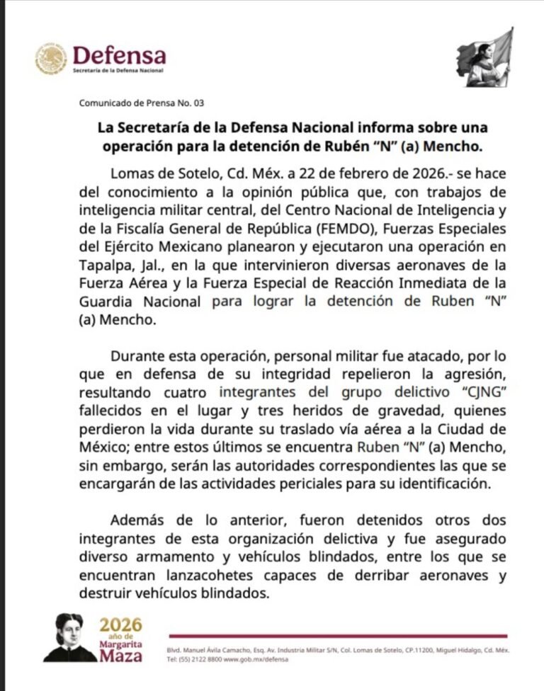 H. Cd. de Chihuahua.- La Secretaría de la Defensa Nacional (SEDENA) informó que este 22 de febrero de 2026, fuerzas especiales del Ejército Mexicano, apoyadas por la Fuerza Aérea, la Guardia Nacional, el Centro Nacional de Inteligencia y la Fiscalía General de la