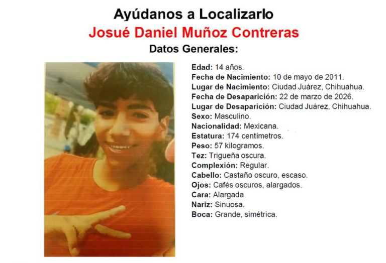 Ciudad Juárez.- La Fiscalía General del Estado activó la Pesquisa Josué Daniel para localizar a Josué Daniel Muñoz Contreras, adolescente de 14 años cuyo paradero no se conoce desde el 22 de marzo en Ciudad Juárez. La autoridad pidió a la población compartir
