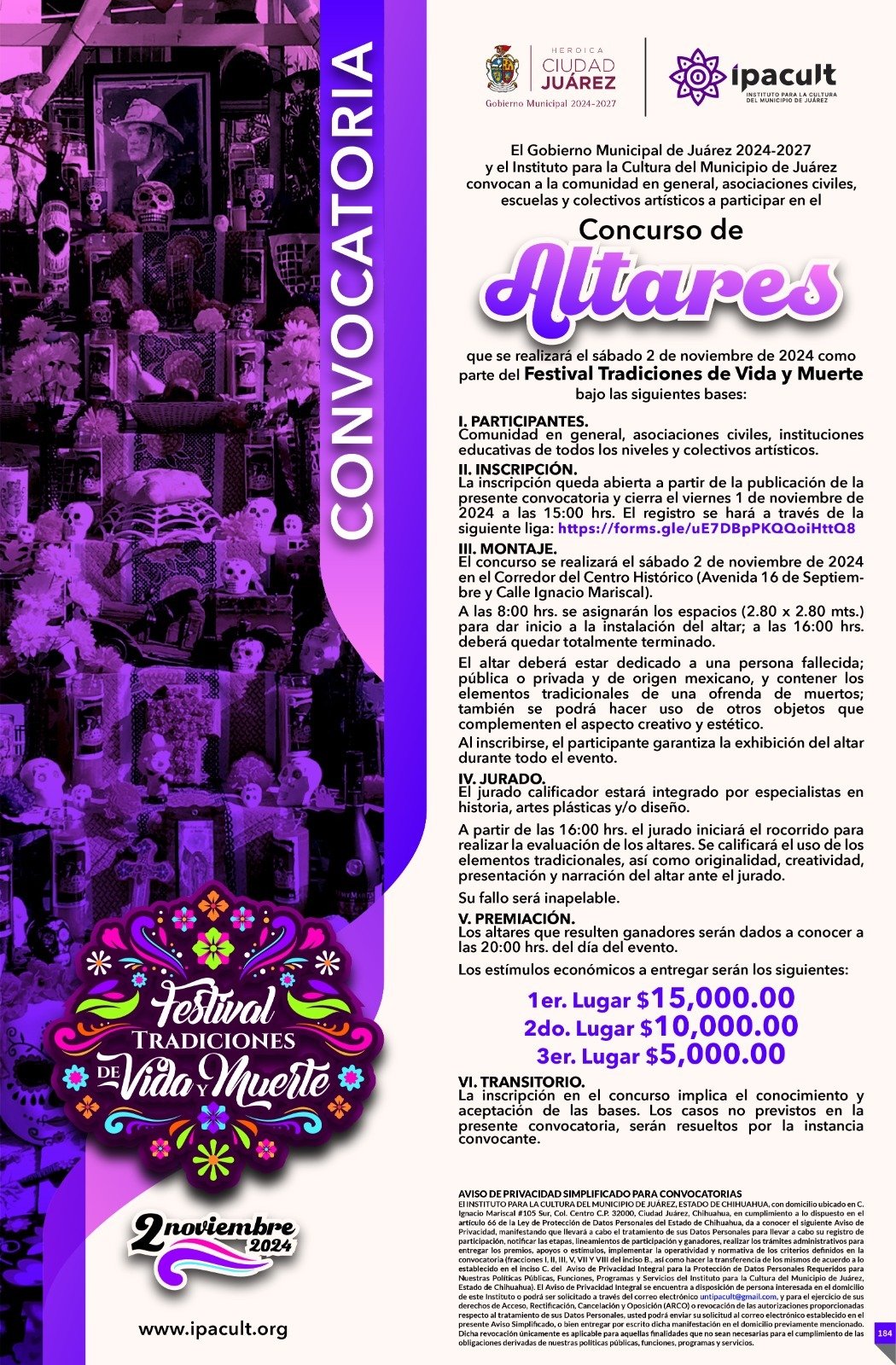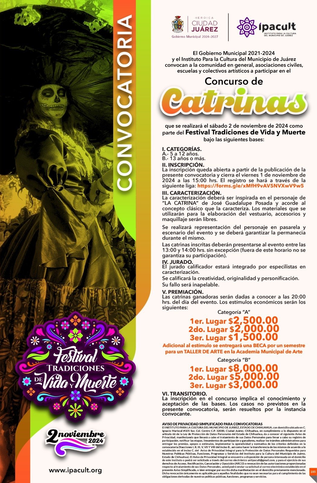El Instituto para la Cultura del Municipio de Juárez (IPACULT) anunció este martes las convocatorias para los concursos de altares y catrinas, como parte del Festival Tradiciones de Vida y Muerte que se celebrará el próximo 2 de noviembre en el Centro Histórico de Ciudad Juárez.