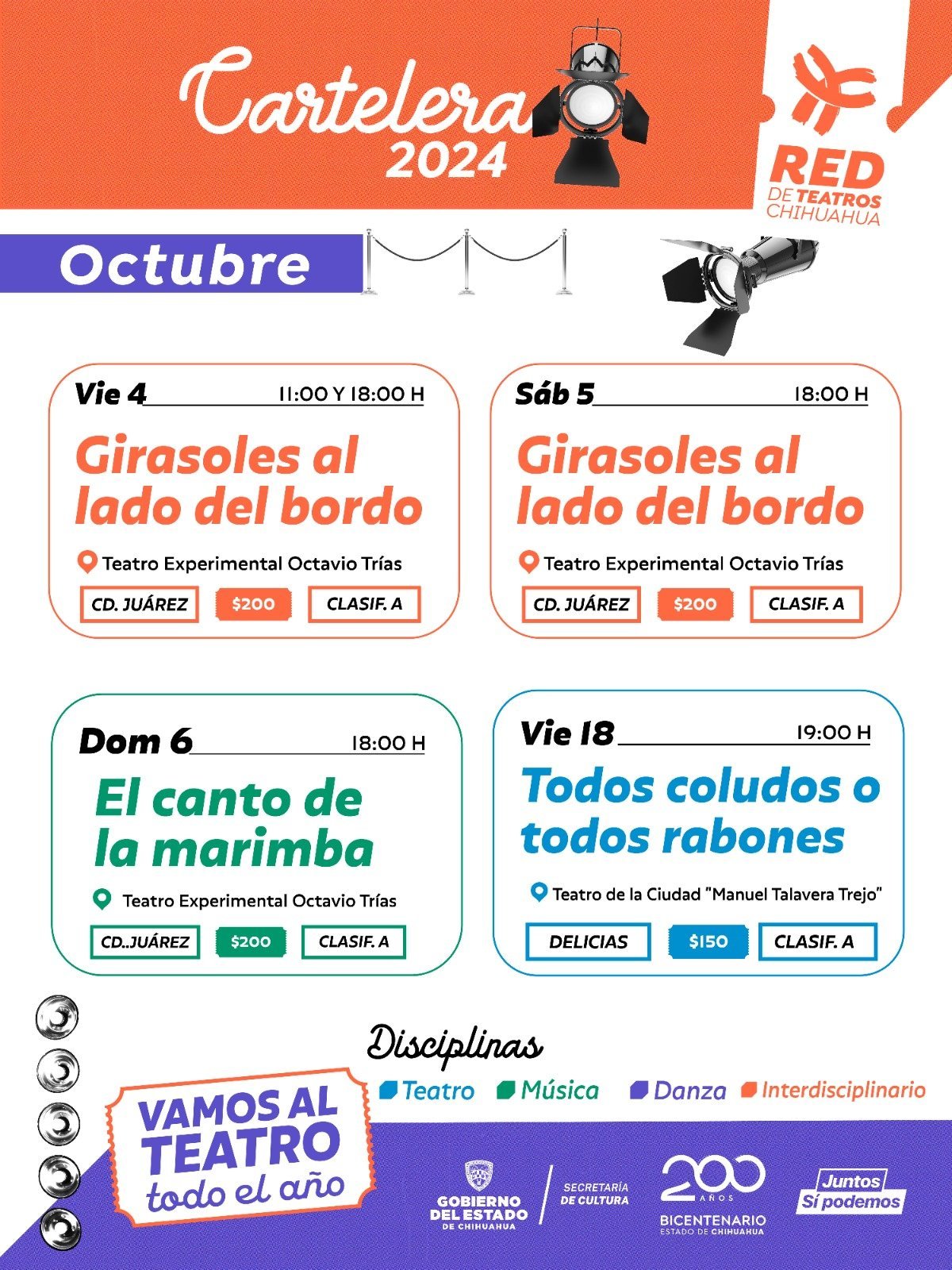 El 18 de octubre la compañía Strongylus Clown presentará “Todos Coludos o todos Rabones”, en el Teatro Manuel Talavera Trejo de Delicias; Ilse Durón ofrecerá “¡Viva la Zarzuela1” en el Teatro Experimental Octavio Trías de Ciudad Juárez el 8 de noviembre; Luz y sombra, compañía de arte contemporáneo interdisciplinario, subirá al escenario con “Bestia, una ópera de cámara regional mexicana”.