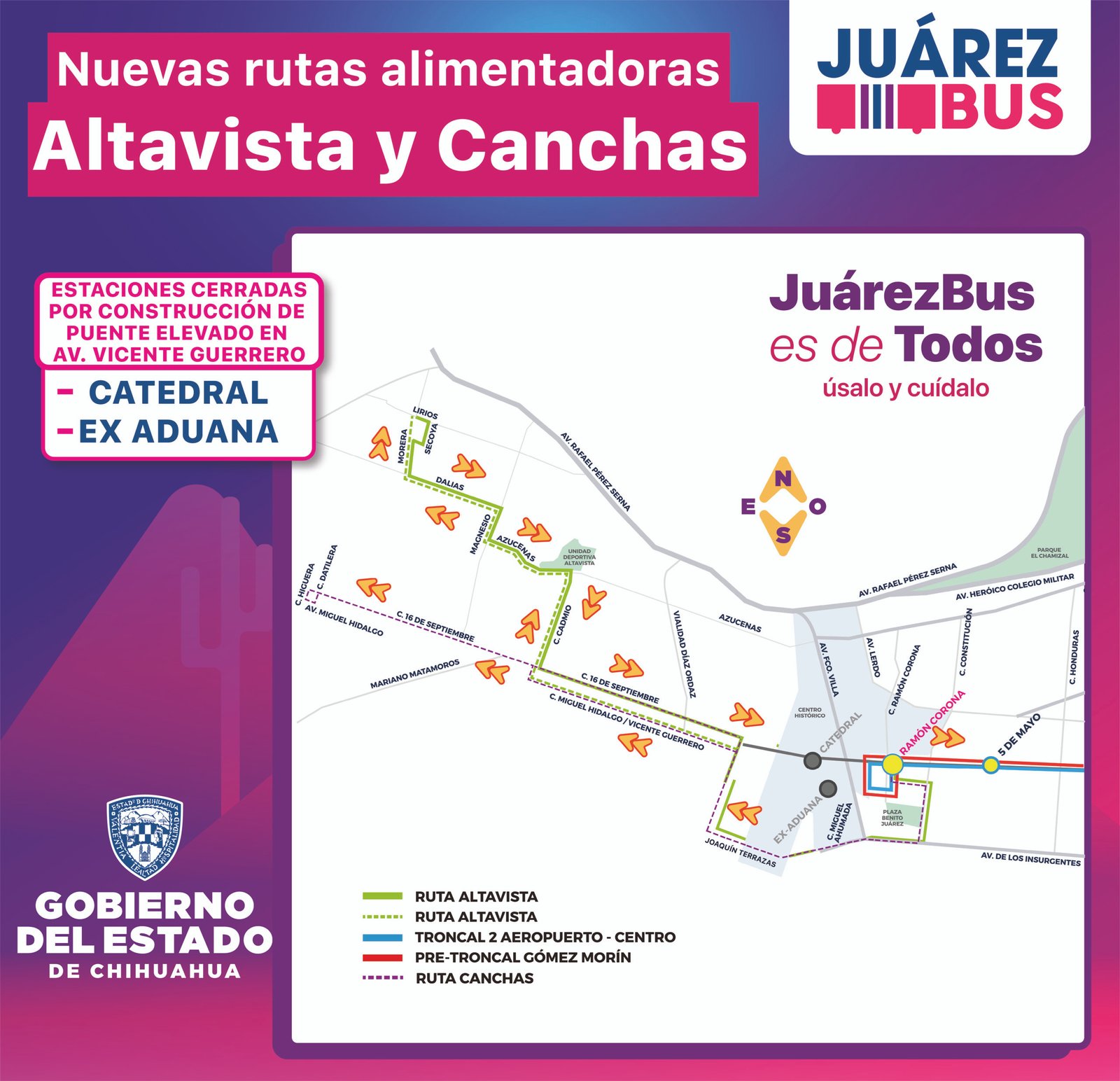 A partir del domingo 13 de octubre, la Secretaría General de Gobierno, a través de la Operadora de Transporte (OTV), pondrá en marcha una nueva ruta temporal del JuárezBus debido a la construcción de un puente elevado sobre la avenida Vicente Guerrero. Como resultado, las estaciones Ex Aduana y Catedral permanecerán cerradas hasta nuevo aviso.