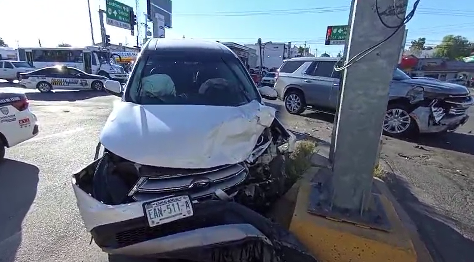 El accidente ocurrió cuando una camioneta Chevrolet Tahoe de reciente modelo intentó girar hacia el periférico R. Almada y colisionó con una camioneta Ford Edge que circulaba en sentido de Cuauhtémoc a Chihuahua.