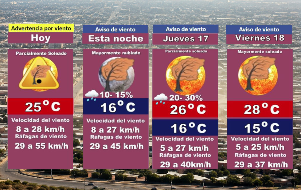 La Dirección General de Protección Civil emitió una advertencia preventiva por vientos ligeros a moderados que se mantendrán hasta las 13:00 horas de hoy, con posibilidad de prolongarse durante los próximos días. Para este miércoles 16 de octubre, se espera un clima parcialmente soleado con una máxima de 25 °C, acompañado por ráfagas de viento que podrían alcanzar los 55 kilómetros por hora.