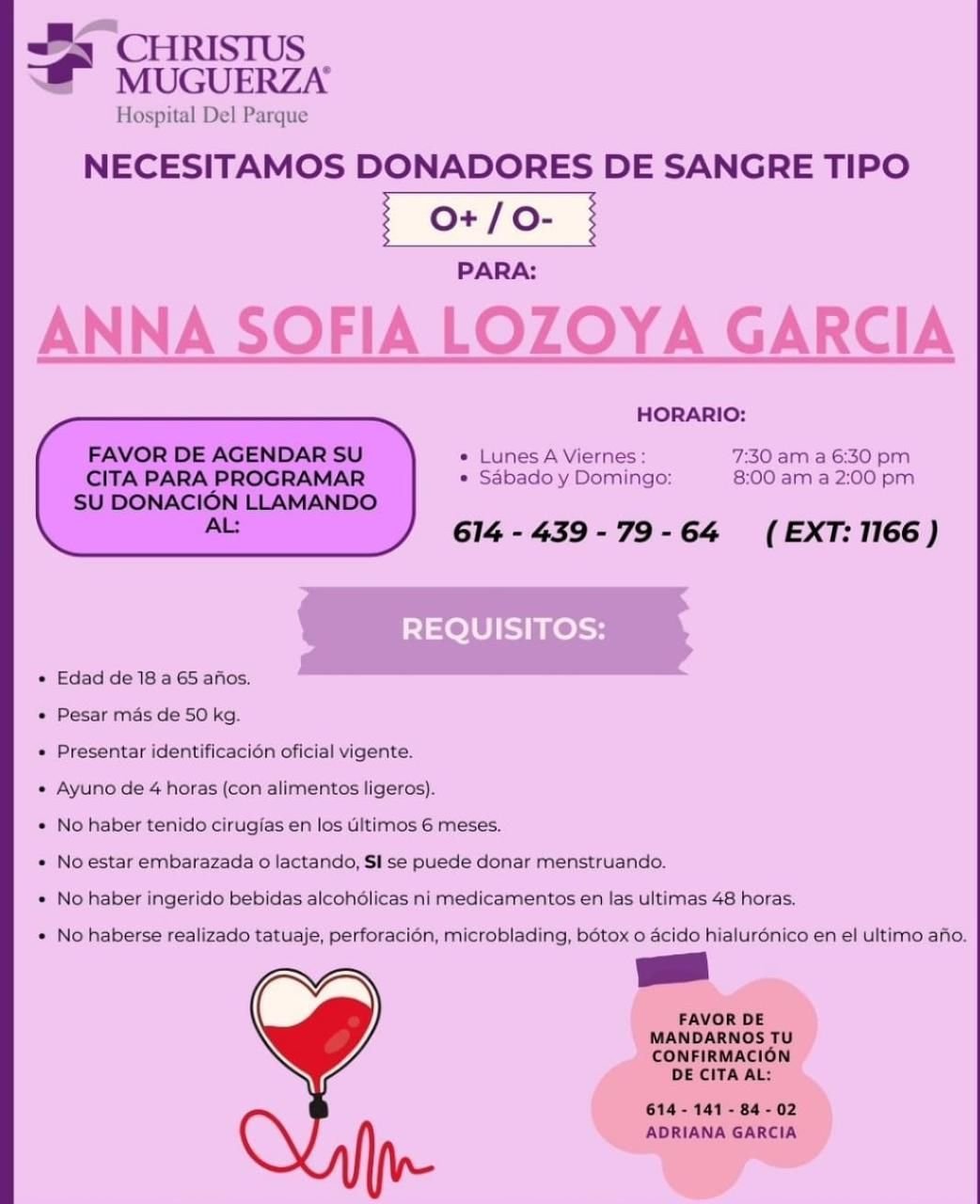 Chihuahua, Chih.- El Hospital Christus Muguerza del Parque está solicitando donadores de sangre tipo O+ y O- para Anna SofĂa Lozoya GarcĂa.