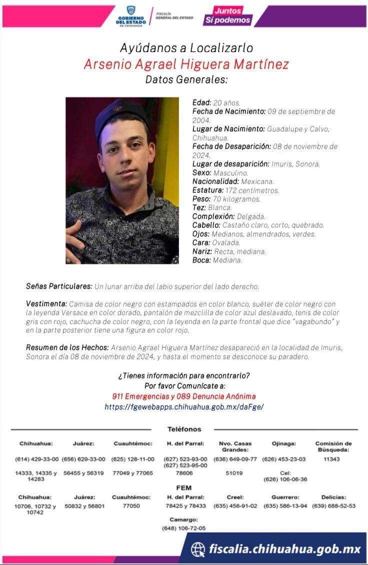 Se trata de Arsenio Agrael Higuera Martínez de 20 años quien nació en Guadalupe y Calvo y al encontrarse en Imuris, Sonora desapareció sin dejar rastro.
