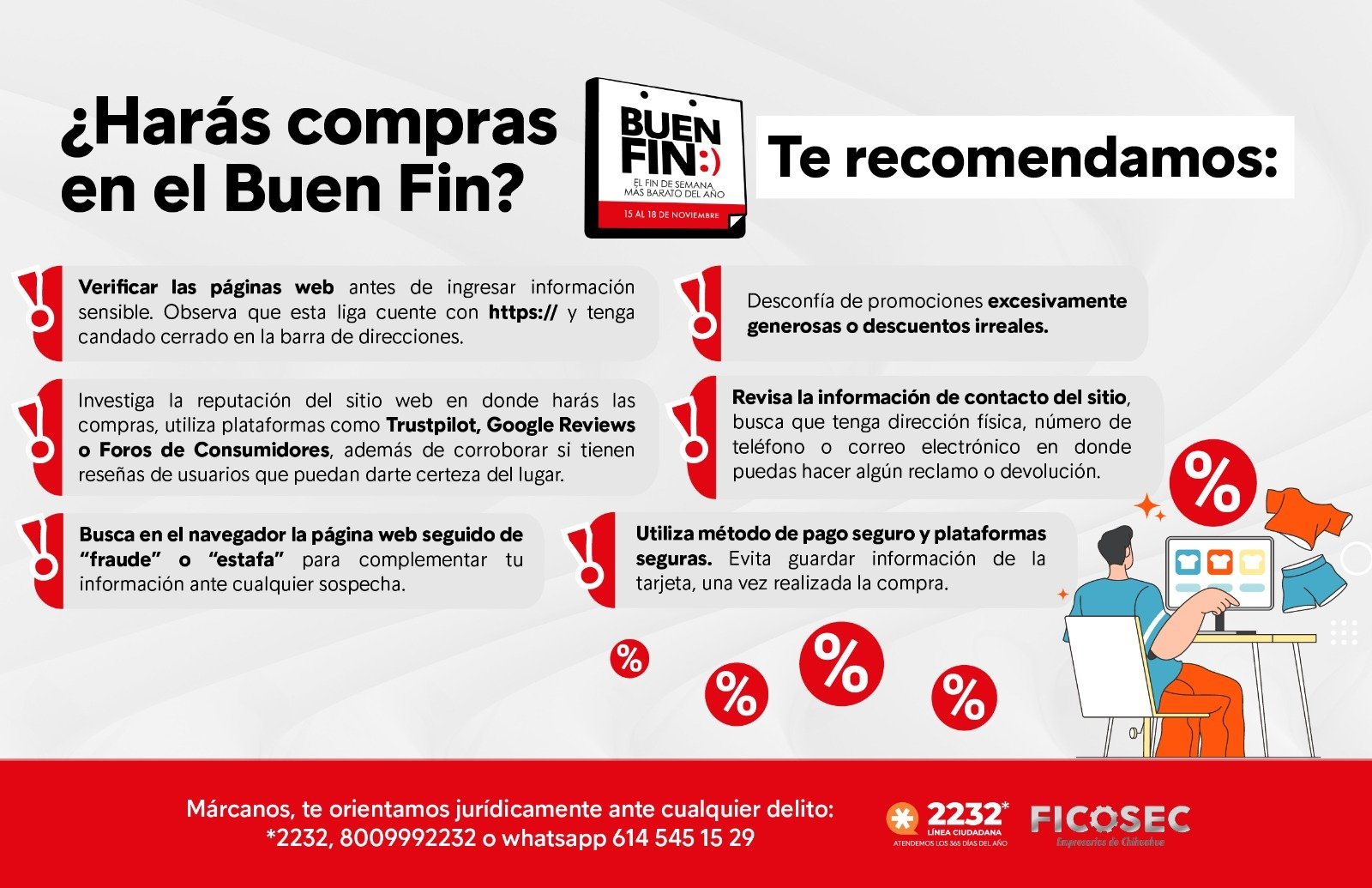 La Línea Ciudadana de FICOSEC llamó a la población a extremar precauciones durante la temporada de compras, especialmente en el Buen Fin, para evitar fraudes en transacciones en línea.
