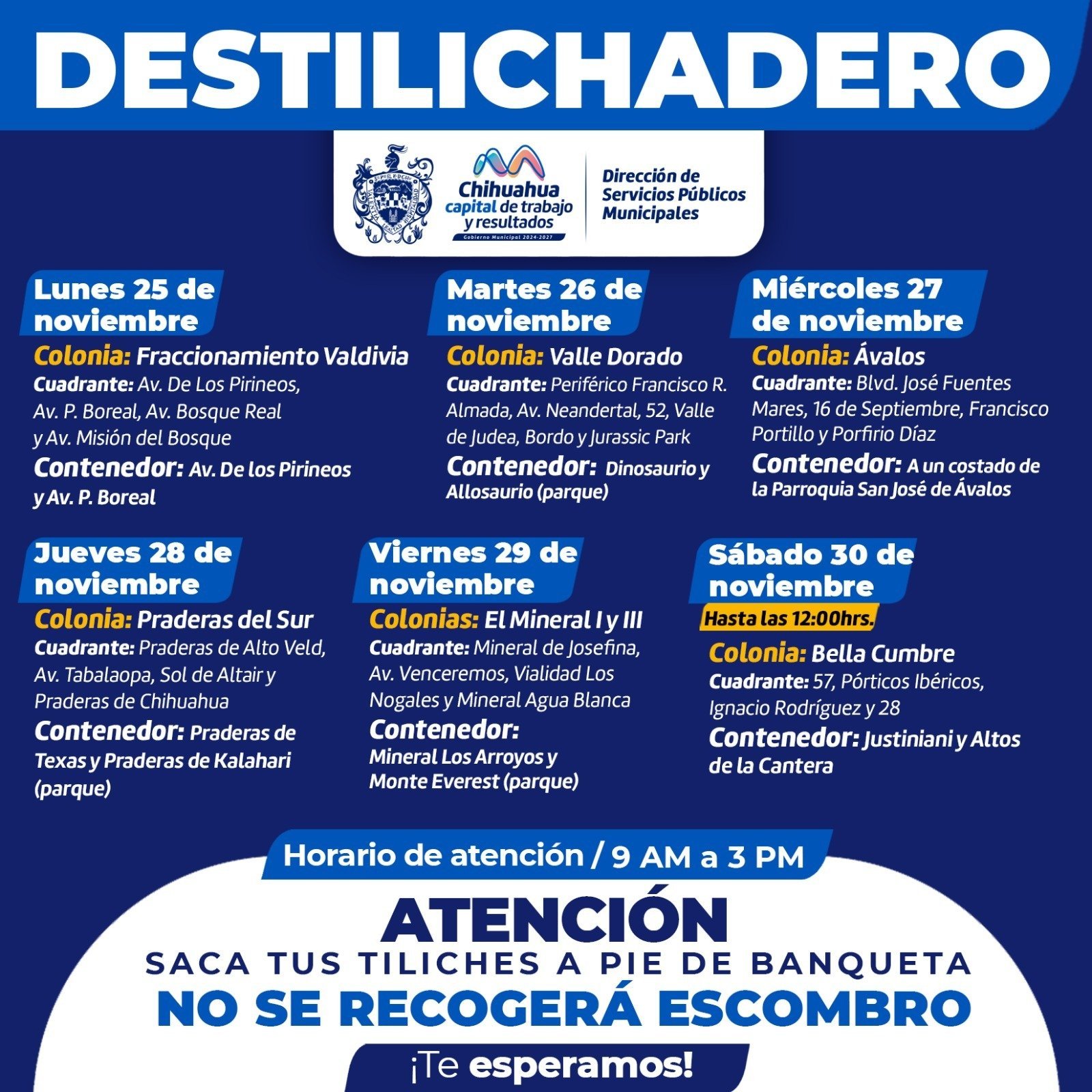 Chihuahua, Chih.- La Dirección de Servicios Públicos Municipales, informa el calendario del programa Destilichadero, que se realizará del 25 al 30 de noviembre en seis colonias de la Capital.