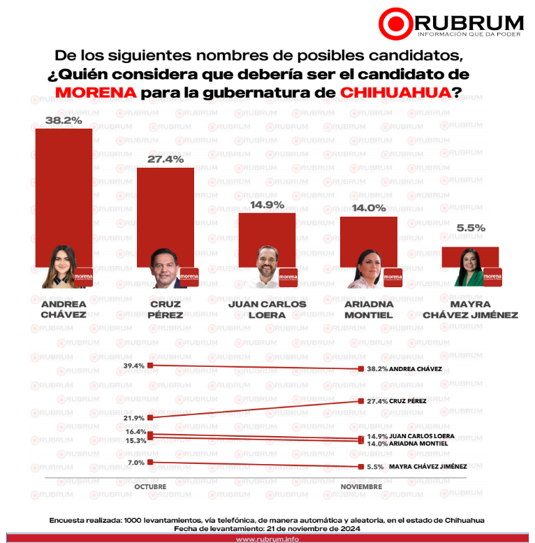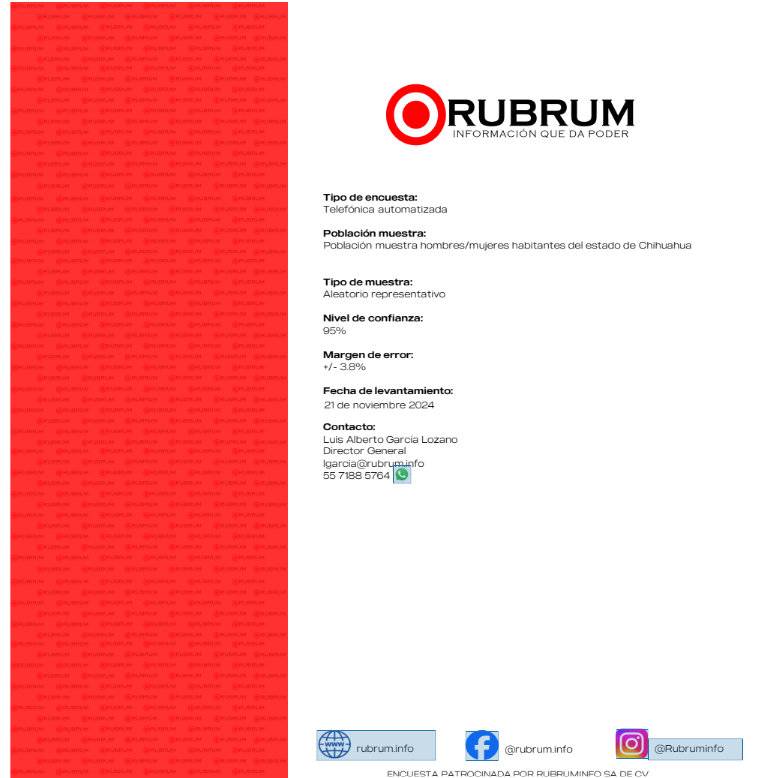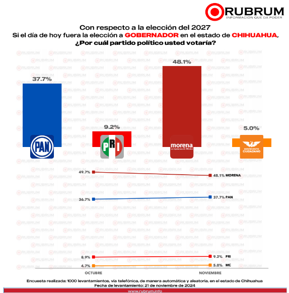 El estudio, con una muestra de 1,000 personas y un margen de error del 3.8%, ofrece un panorama preliminar sobre la competencia electoral en el estado rumbo a 2027(CHIH 27 20241121).