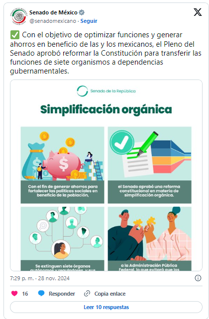 El Pleno del Senado aprobó con 86 en favor de Morena, Partido Verde y PT, y 42 en contra de PAN, PRI y Movimiento Ciudadano, la desaparición de siete órganos autónomos, entre ellos el INAI y el Instituto Federal de Telecomunicaciones.