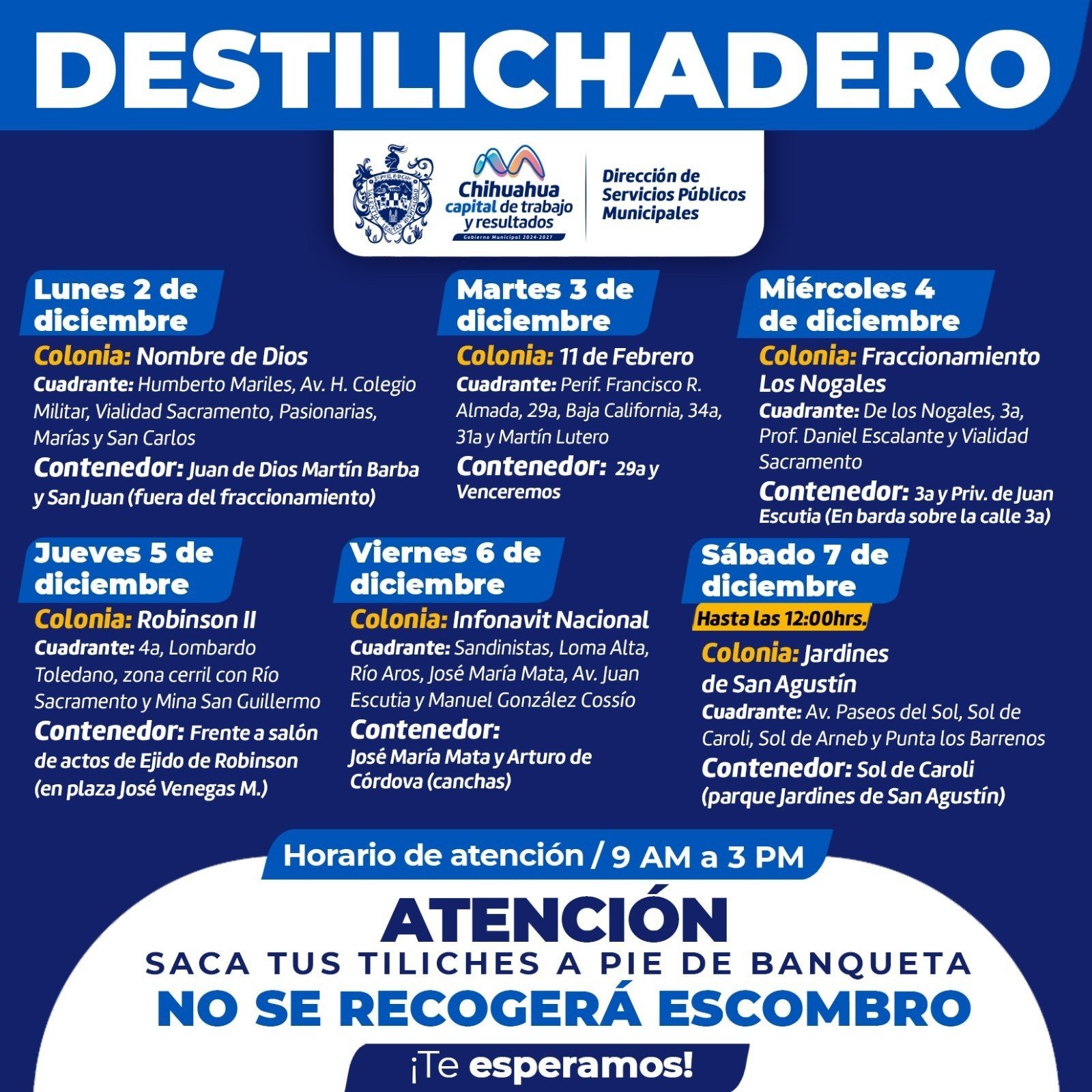 Chihuahua, Chih.- La Dirección de Servicios Públicos Municipales, informa el calendario del programa Destilichadero, que se realizará del 2 al 6 de diciembre en seis colonias de la Capital, con el objetivo de evitar acumulaciones de basura de grandes dimensiones en las viviendas, que podría generar plagas o problemas de salud,