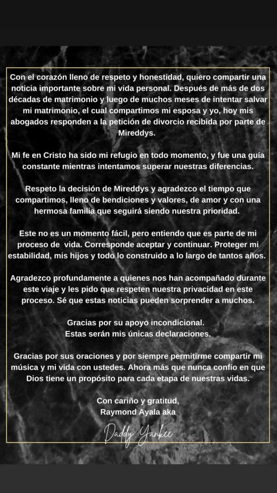“Después de más de dos décadas de matrimonio y meses intentando salvar nuestra relación, hoy mis abogados responden a la petición de divorcio presentada por Mireddys”, explicó el intérprete de Gasolina. A pesar de este desenlace, el artista subrayó que su familia seguirá siendo su principal prioridad.