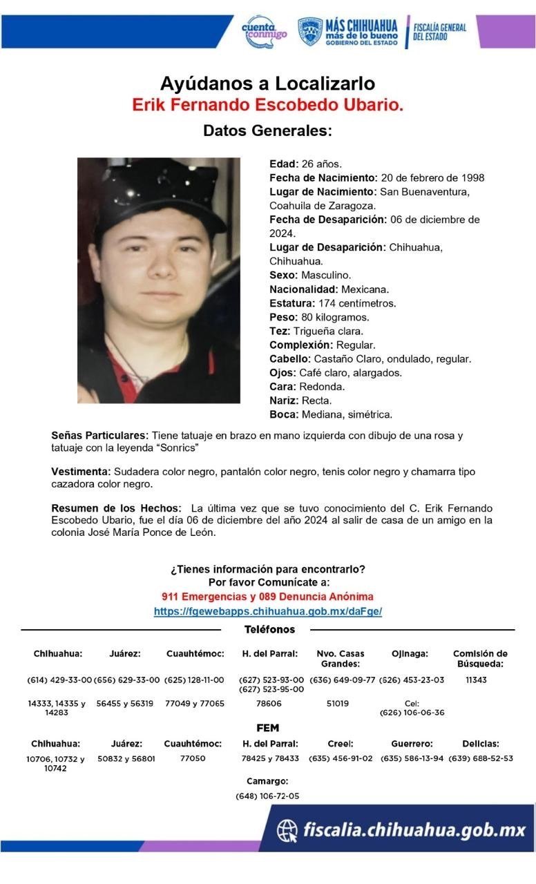 Chihuahua, Chih.- Erik Fernando Escobedo Ubario, un joven de 26 años originario de San Buenaventura, Coahuila, y residente del estado de Chihuahua, fue reportado como desaparecido desde el pasado viernes 6 de diciembre.