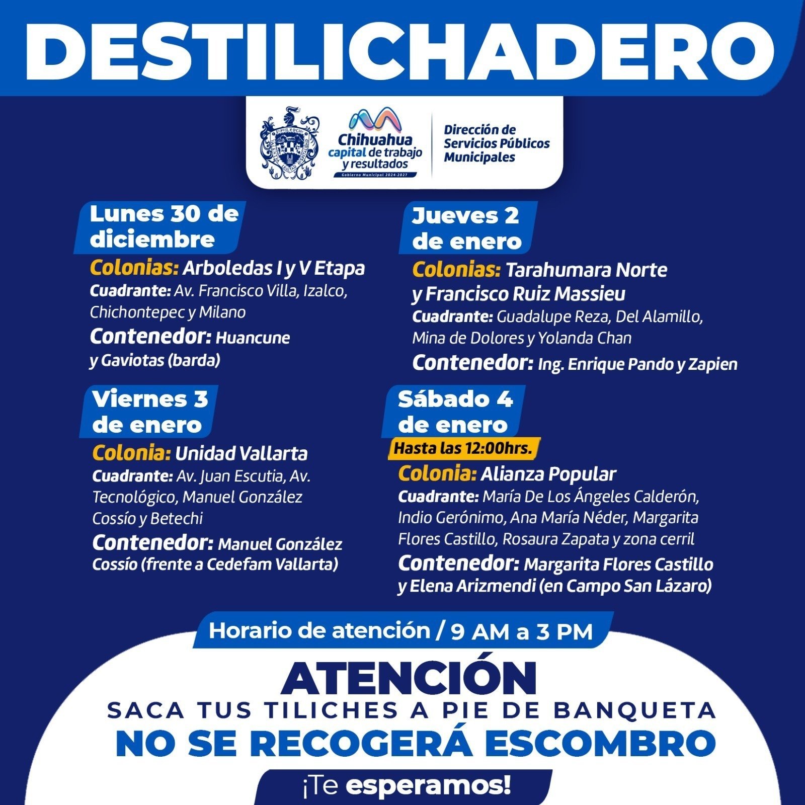 Chihuahua, Chih.- El Gobierno Municipal de Chihuahua anunció el calendario del programa Destilichadero, que se llevará a cabo del 30 de diciembre al 4 de enero en seis colonias de la ciudad.