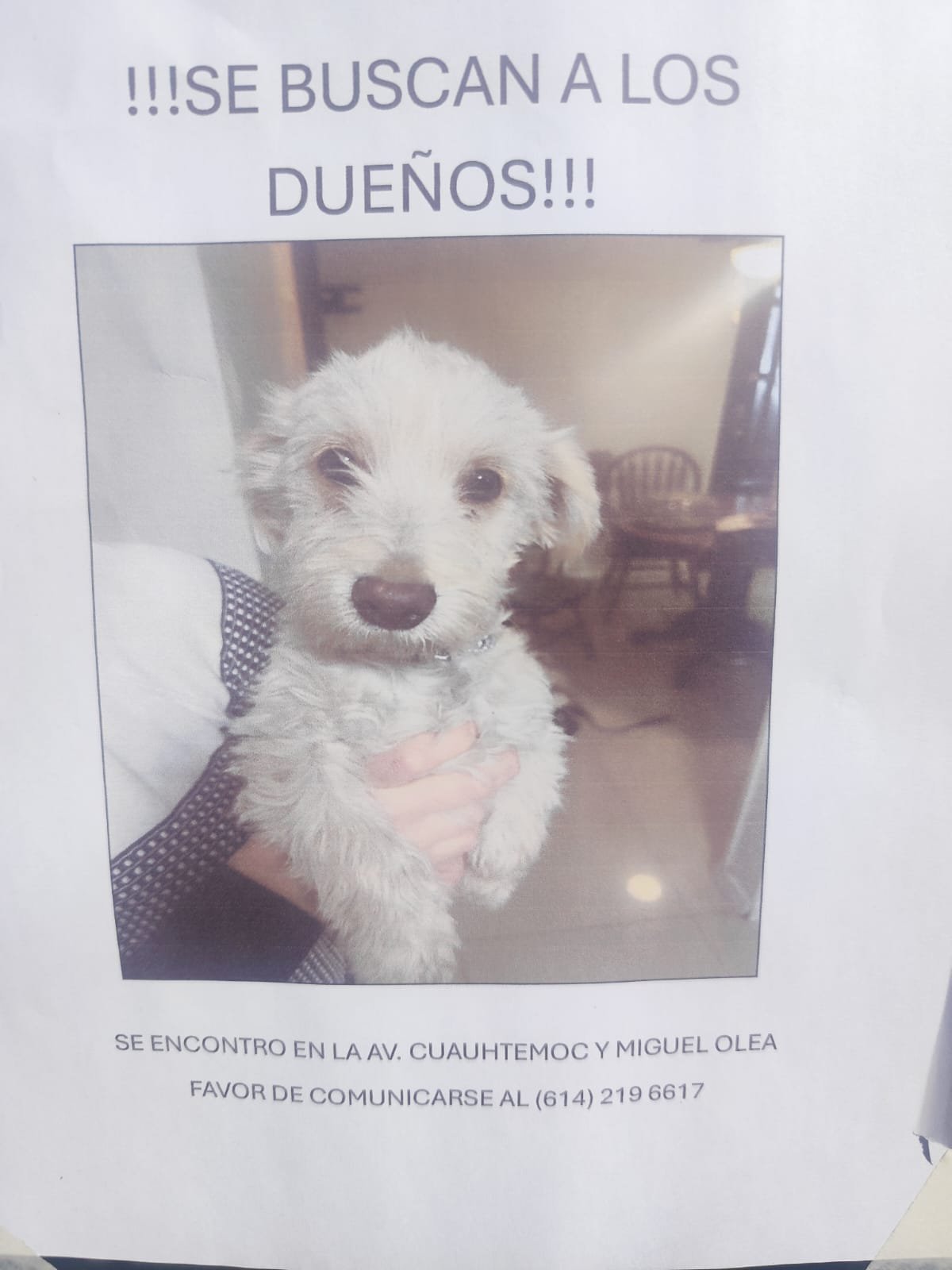 Chihuahua, Chih.- Buscan a dueños de la perrita que se encontraron en la Av. Cuauhtémoc y Miguel Olea, la cual empezaron a colocar letreros de las calles de la colonia Zarco desde antier.