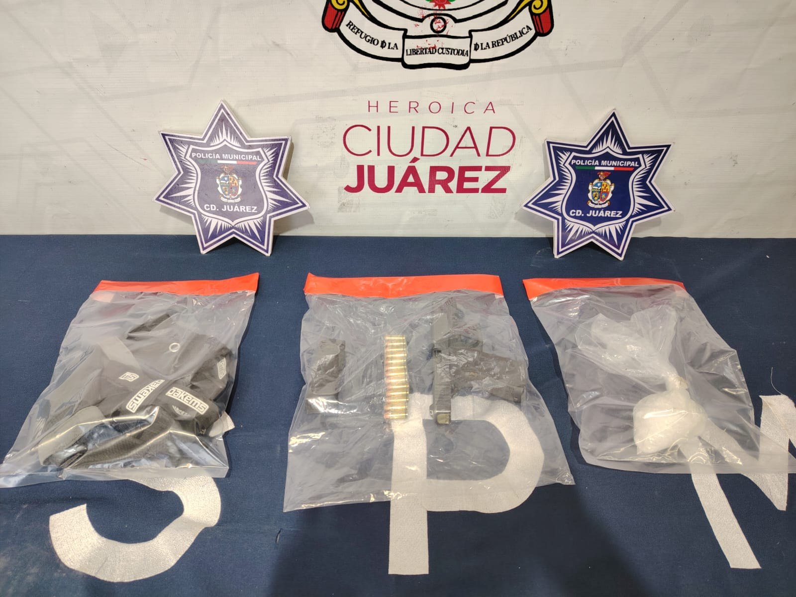 Ciudad Juárez.- Agentes de la Secretaría de Seguridad Pública Municipal (SSPM) detuvieron a Clara Susana S. H., acusada de presuntamente violar la Ley Federal de Armas de Fuego y Explosivos y cometer delitos contra la salud.