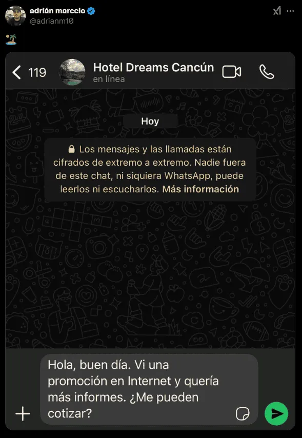 Adrián compartió en X (antes Twitter) una captura de pantalla de un supuesto chat de WhatsApp con un contacto guardado como “Hotel Dreams Cancún”, acompañado de comentarios sarcásticos como: