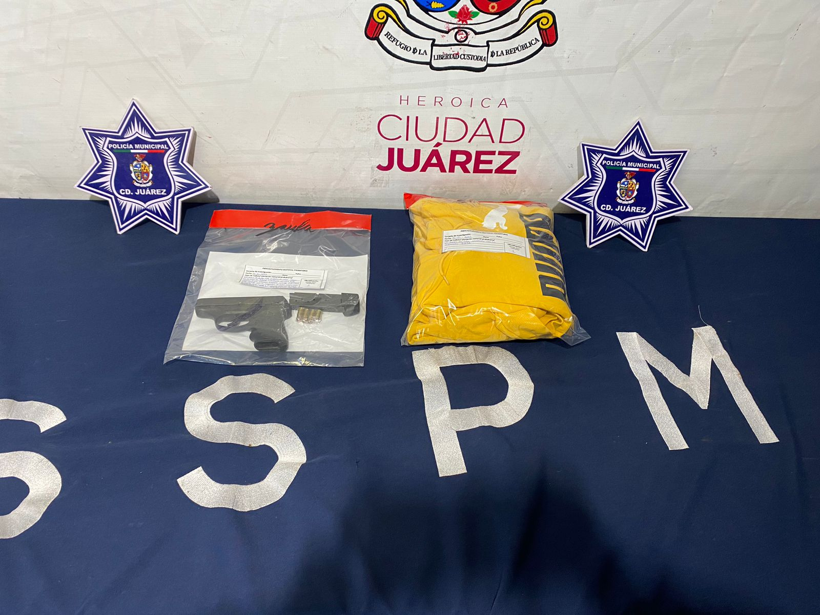 Ciudad Juárez.- Elementos de la Secretaría de Seguridad Pública Municipal (SSPM) detuvieron a José Ventura G. T., Carlos Alfonso C. R. y José de Jesús V. O., tras localizarles un arma de fuego calibre 9 milímetros en su vehículo, un Nissan March blanco modelo 2018, durante un operativo de vigilancia en la avenida 16 de Septiembre y Lerdo, en la zona Centro.