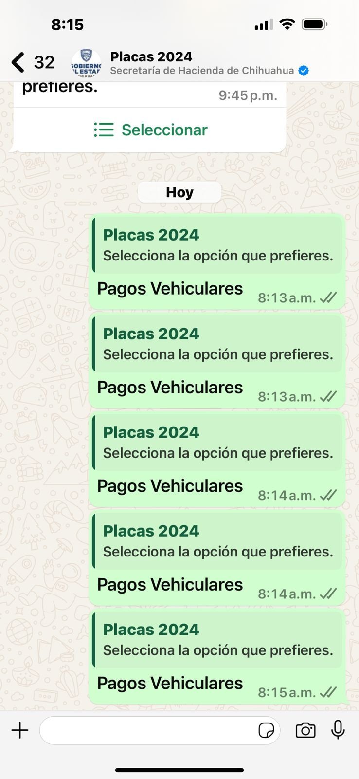 Chihuahua, Chih.- Varios usuarios reportaron problemas al intentar realizar el pago de la revalidación vehicular a través de la aplicación de WhatsApp, un método alterno habilitado por la Secretaría de Hacienda.