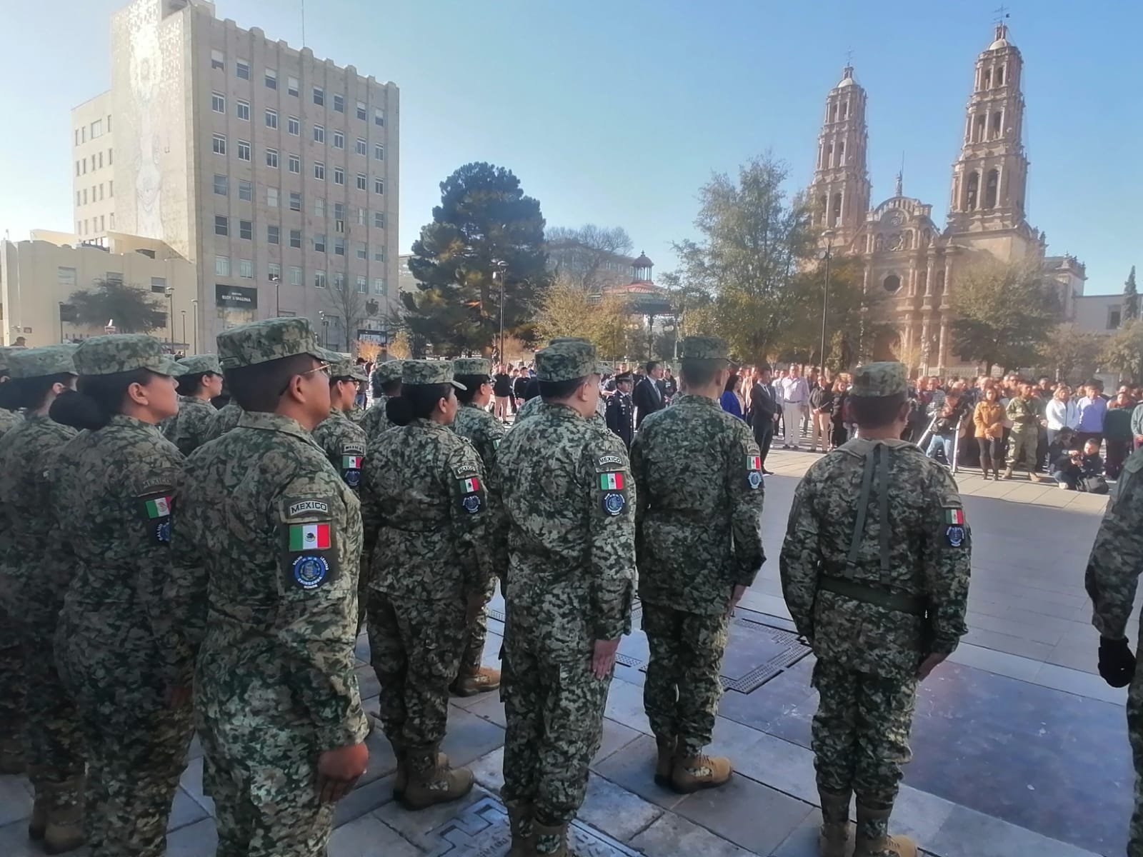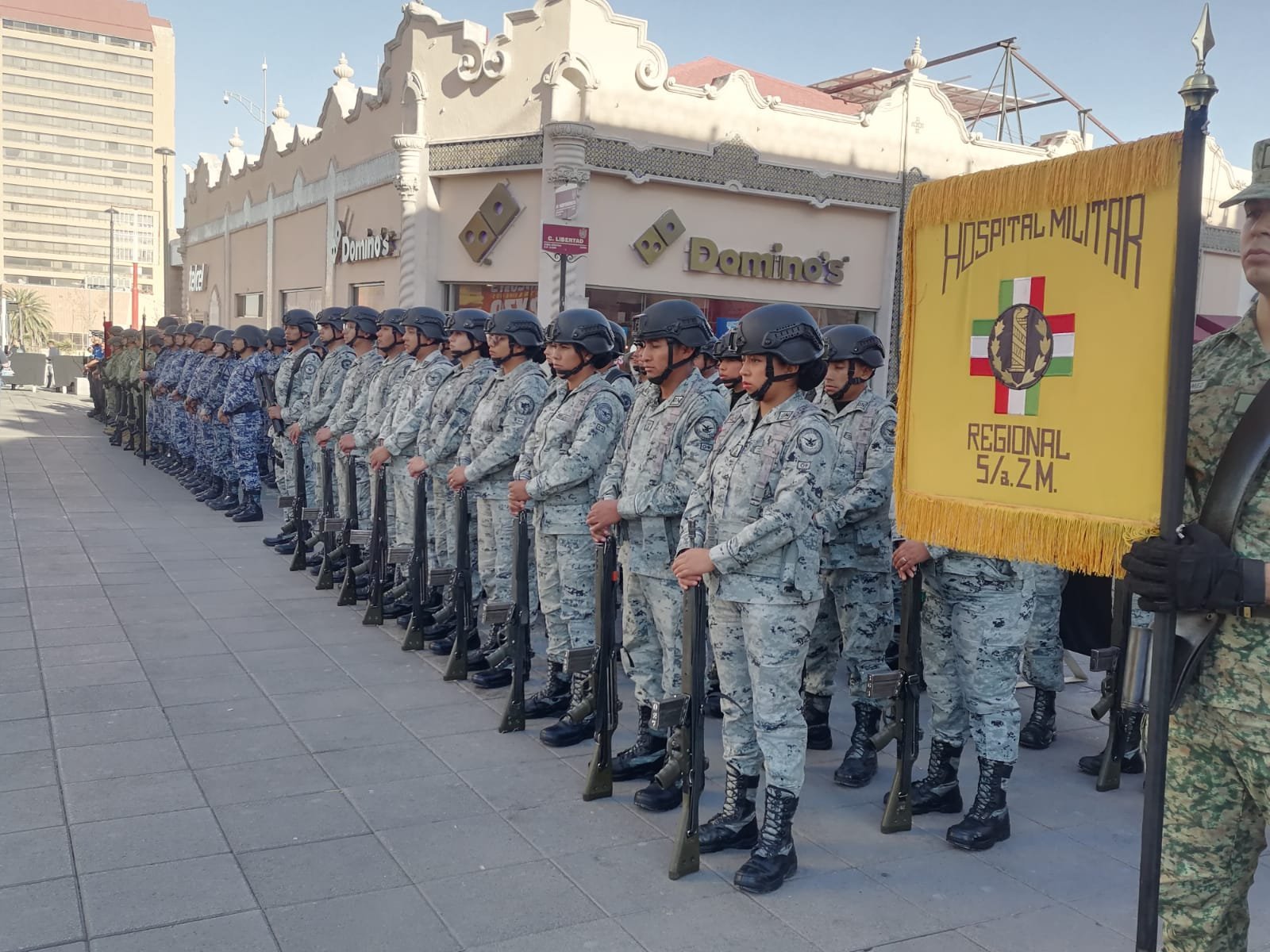 Durante la ceremonia, fueron acompañados por la banda de guerra de la zona militar, así como por estudiantes de una escuela local, quienes, junto con los presentes, entonaron el Himno Nacional Mexicano en un emotivo momento de unidad y patriotismo.