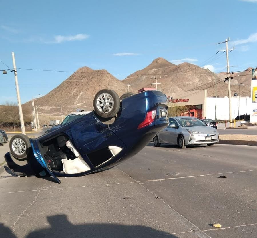 Chihuahua, Chih.- Un fuerte choque con volcadura ocurrió esta tarde en la intersección de la avenida Monte Albán y calle Montes Celeste, dejando como saldo un conductor con lesiones de consideración y un Nissan Versa patas pa’ arriba.