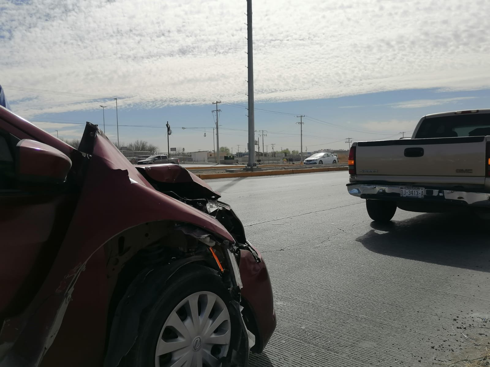 El incidente ocurrió mientras ambos vehículos circulaban de norte a sur. Un Nissan Versa rojo chocó contra una camioneta GMC Sierra color café al intentar ingresar a la vialidad.