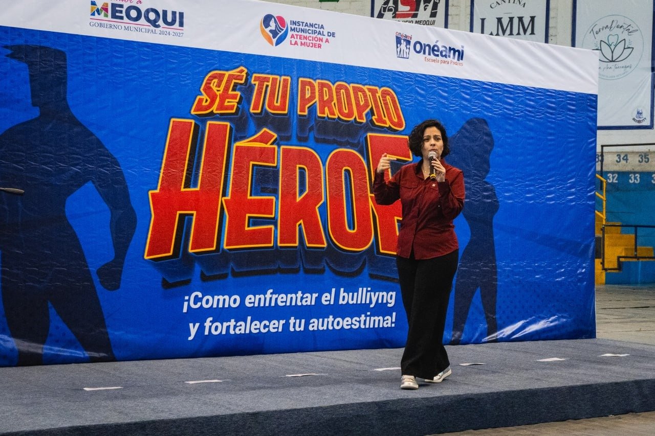 Meoqui – Como parte de la Semana de la Familia, se llevó a cabo la conferencia “Sé tu propio Héroe”, gracias a la colaboración entre Gobierno Municipal de Meoqui, a través de la Instancia Municipal de Atención a la Mujer y Oneamí, Escuela para Padres, donde se abordó el tema de crear conciencia sobre el bullying y autoestima en las adolescencias en un evento realizado en el Gimnasio Municipal Carlos Stege, con la asistencia de cerca de 900 alumnos de la Secundaria Estatal 3026 y el CBTa 147.