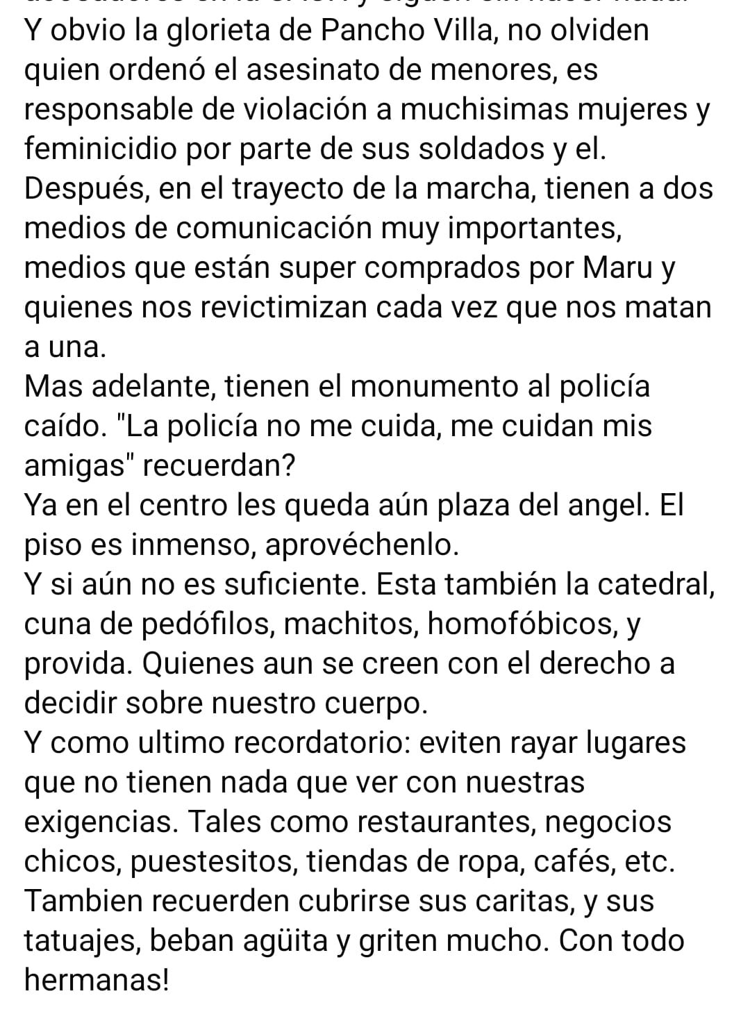 El mensaje finaliza con referencias a la Plaza del Ángel y la Catedral, llamando a aprovechar estos espacios para plasmar las exigencias feministas, mientras pide evitar afectar pequeños negocios.