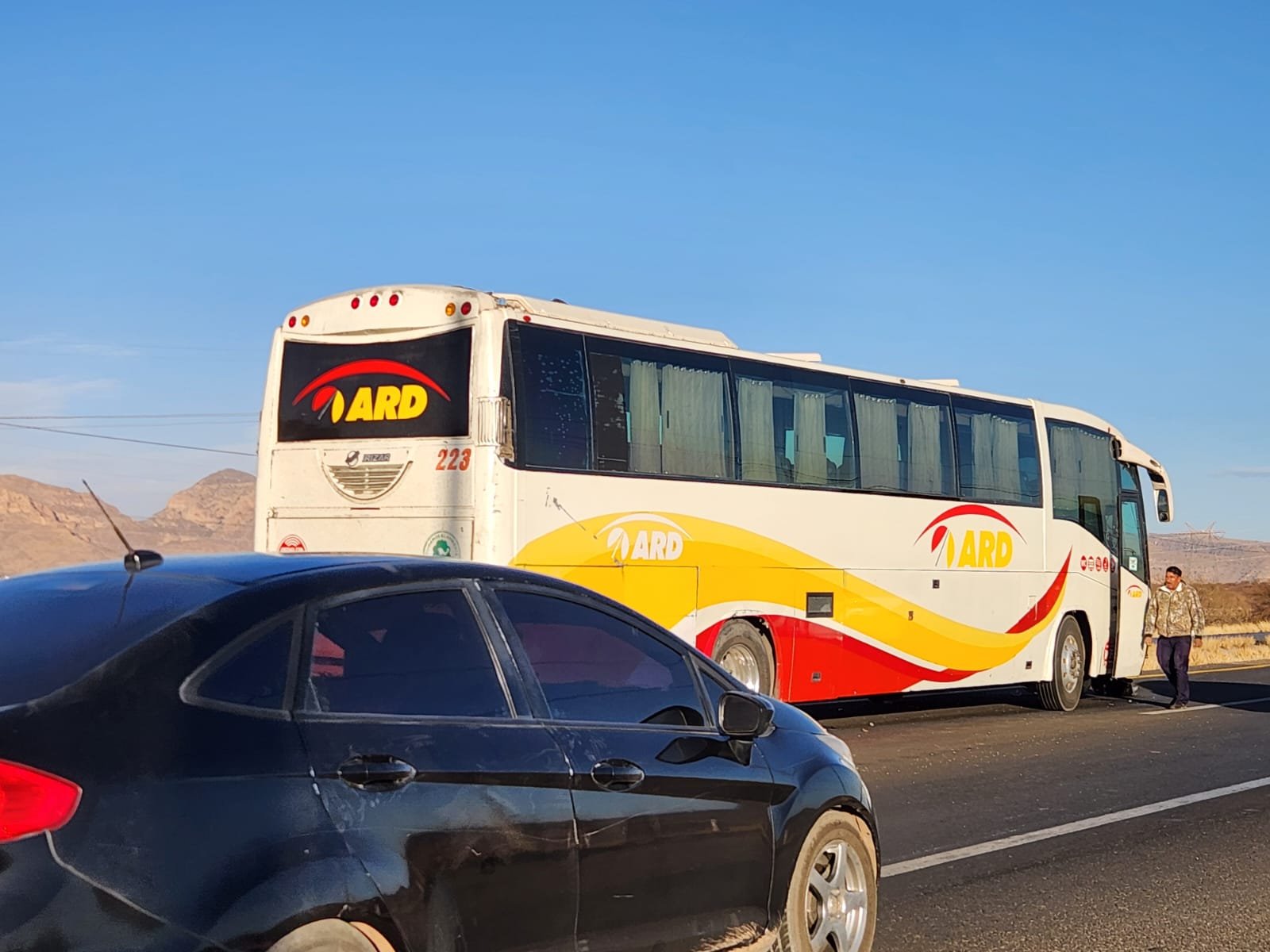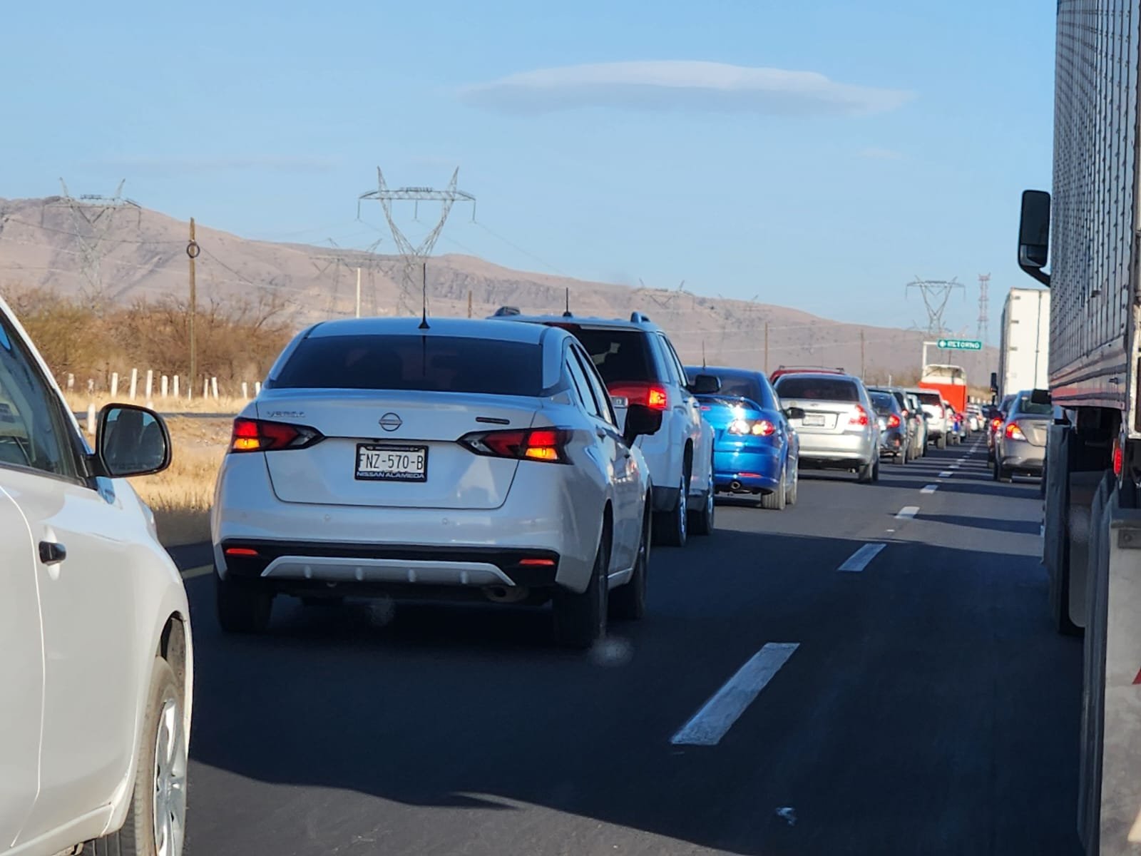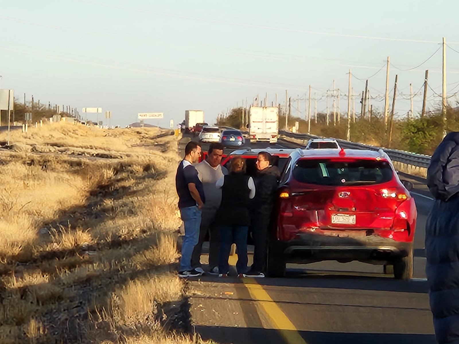 Chihuahua, Chih.- Un fuerte accidente se registró en el kilómetro 198 de la carretera a Delicias, donde un camión de pasajeros de Rápidos Delicias no logró detenerse a tiempo e impactó contra varios vehículos que estaban parados en la vía.