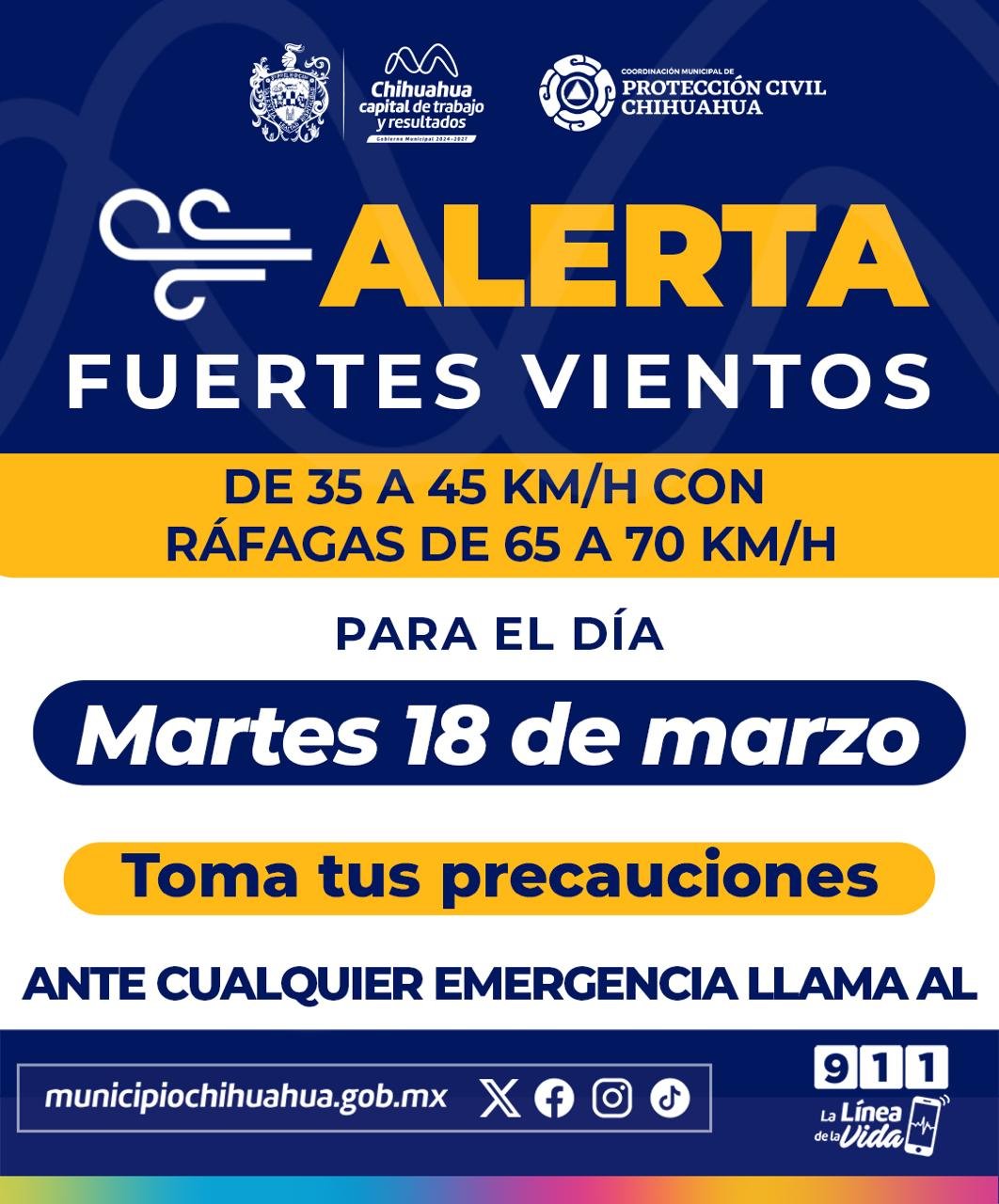 Alerta Protección Civil Municipal por ráfagas de viento para esta semana 17 marzo, 2025 No hay comentarios Leer más