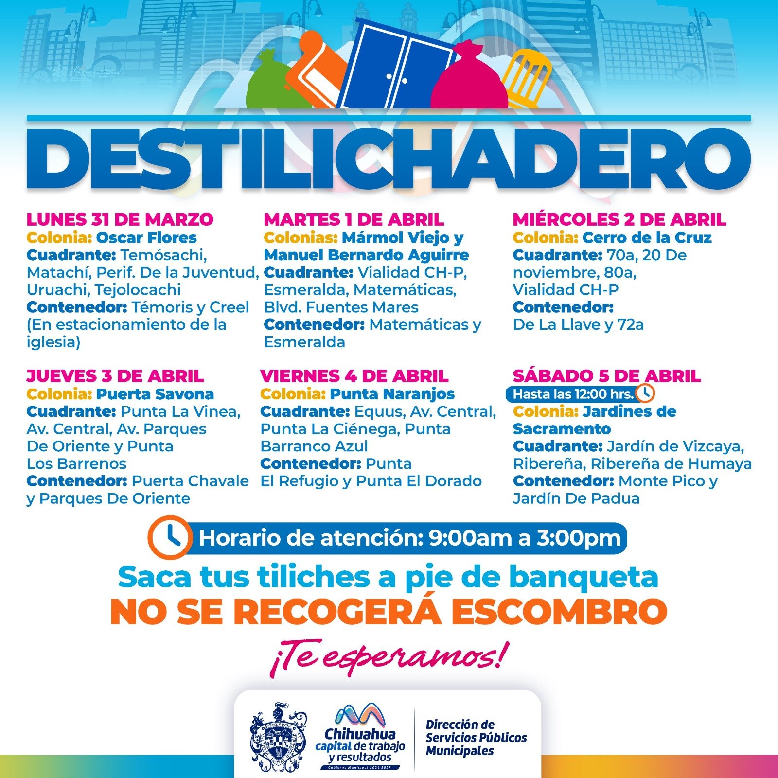 Chihuahua, Chih.- La Dirección de Servicios Públicos, pone en marcha el programa Destilichadero, que se llevará a cabo del 31 de marzo al 5 de abril en siete colonias de la ciudad.