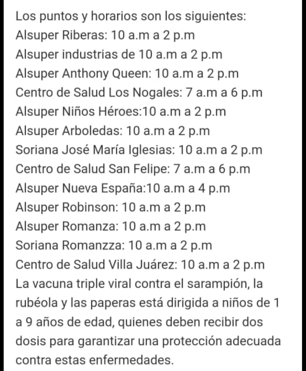Será hasta en punto de las 6 de la tarde en las que los diferentes puntos de vacunación esparcidos por toda la ciudad se retiren por lo que se invita a la población a acudir a dichos puntos de vacunación a aplicarse las vacunas y poder mitigar el brote de sarampión en la entidad.