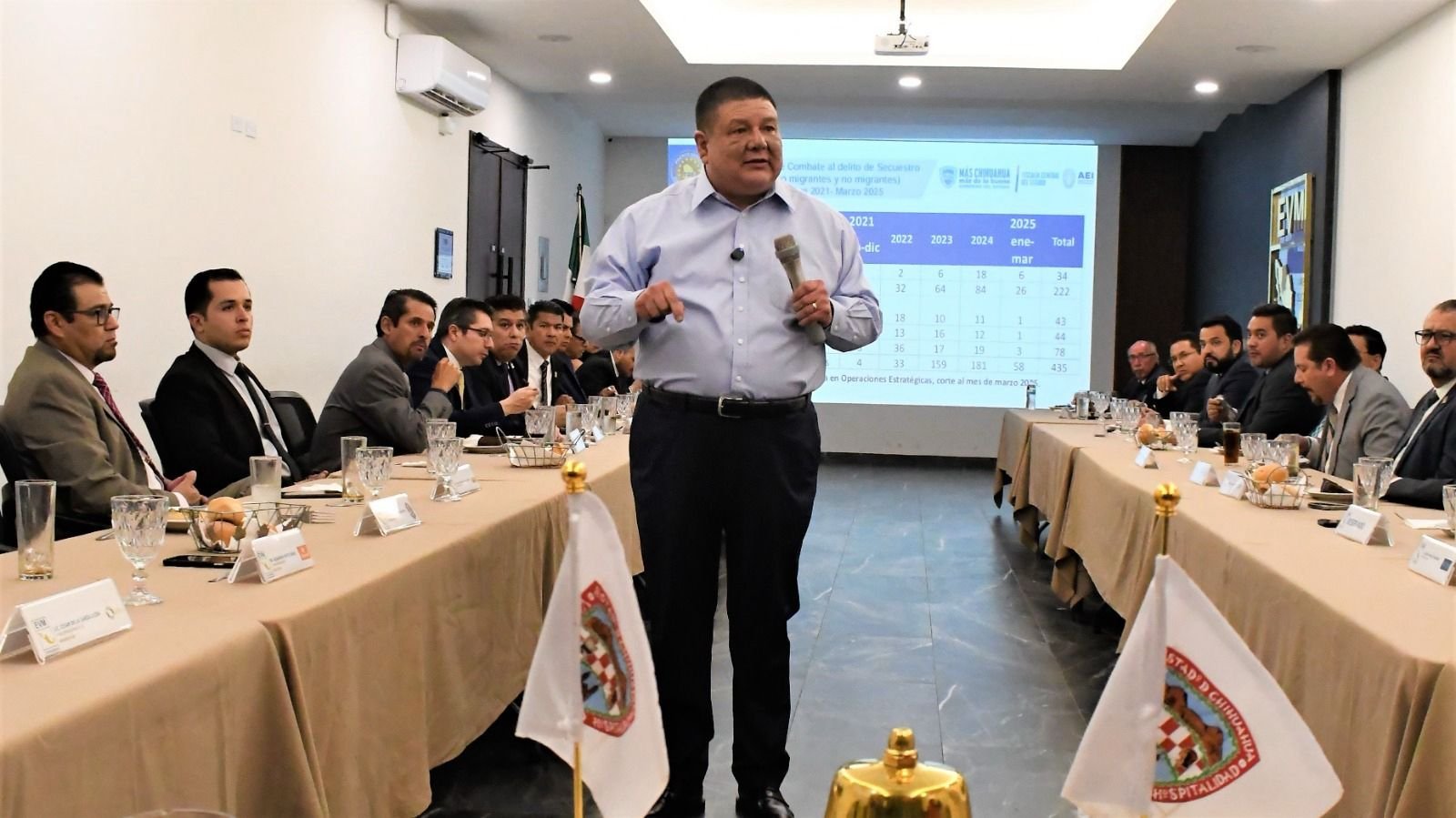 Durante el encuentro, el Fiscal destacó que Chihuahua cuenta actualmente con uno de los Grupos Antisecuestros más profesionales del país. Aseguró que en Ciudad Juárez se ha logrado detener a todos los involucrados en casos recientes de secuestro y extorsión, quienes ahora enfrentan procesos penales que podrían derivar en condenas de hasta 50 años de prisión.