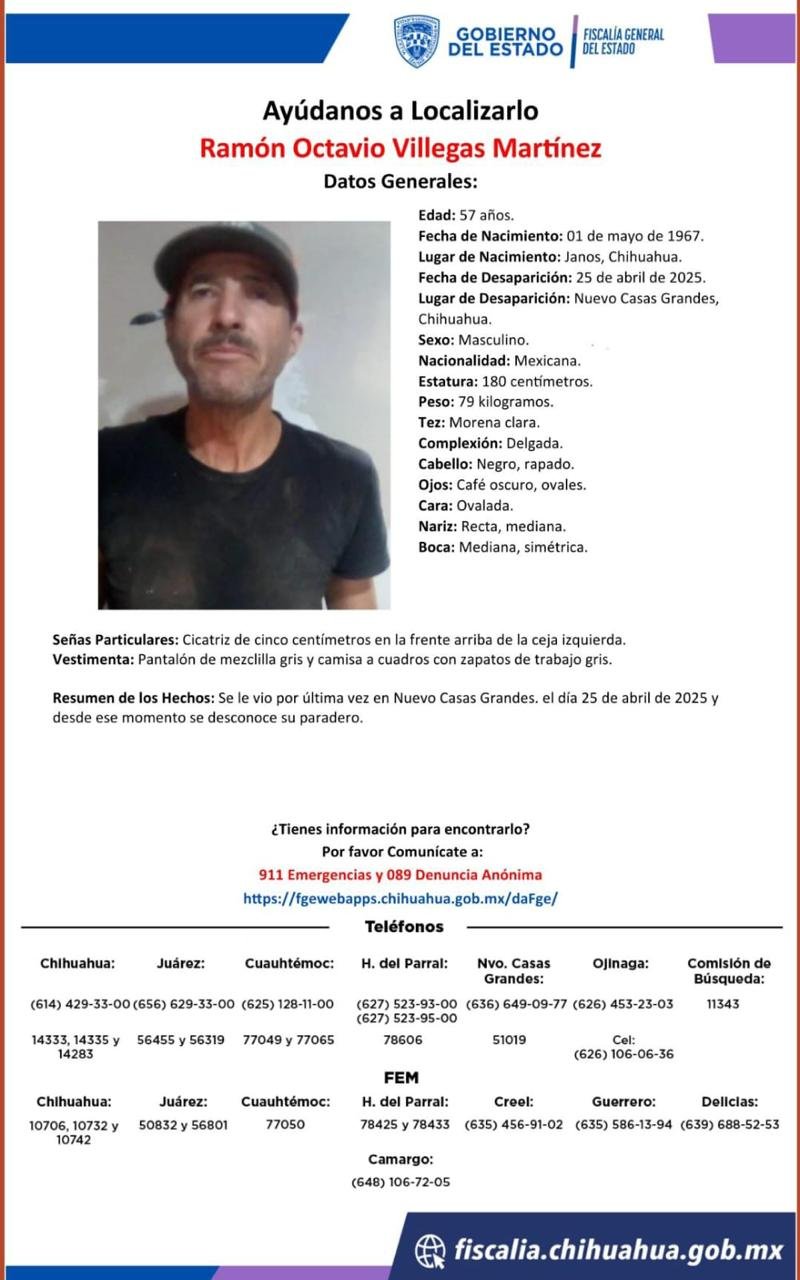 La Fiscalía General del Estado de Chihuahua emitió pesquisas para solicitar el apoyo de la ciudadanía en la localización de Fernando Chacón Núñez y Ramón Octavio Villegas Martínez, quienes fueron reportados como desaparecidos el 25 de abril de 2025 en Nuevo Casas Grandes.