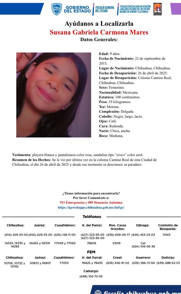 Se trata de Gabriela Carmona mares de 9 años de edad quien fue vista por última vez el pasado 26 de abril del 2025 en la Colonia camino Real.