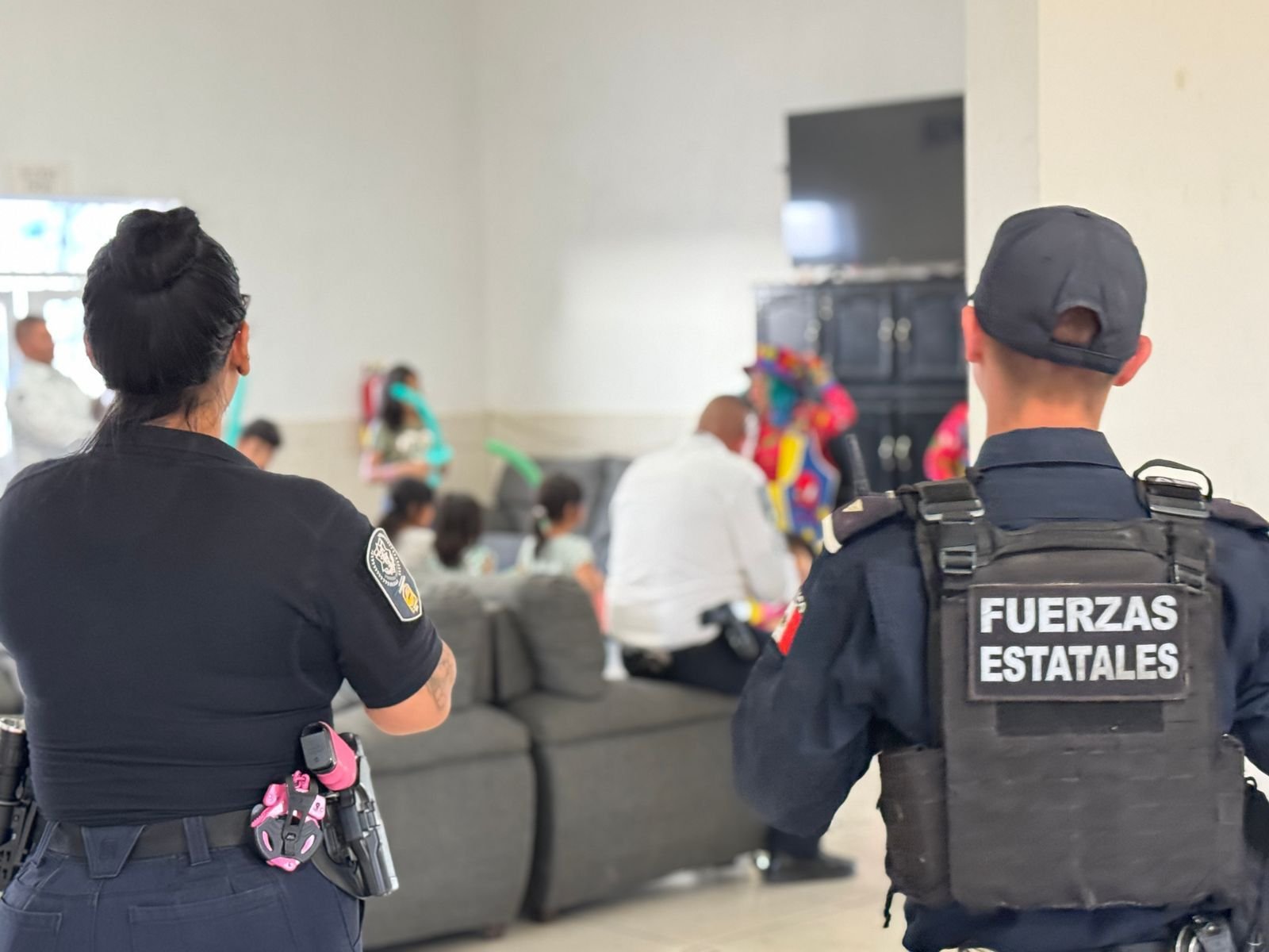 Durante la visita, elementos de la Policía Estatal organizaron un convivio que incluyó la entrega de pizzas, un show de payasos y figuras de globos, con el objetivo de brindar un momento de alegría y celebración a las infancias en un ambiente seguro y cálido.