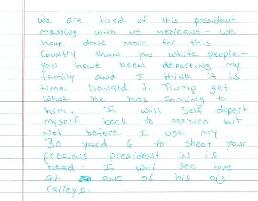 La misiva fue recibida un día antes por un oficial de inmigración, escrita a mano en inglés, con tinta verde, donde el sujeto expresaba su odio hacia las políticas migratorias y anunciaba que usaría un rifle para dispararle a Trump antes de autodeportarse.