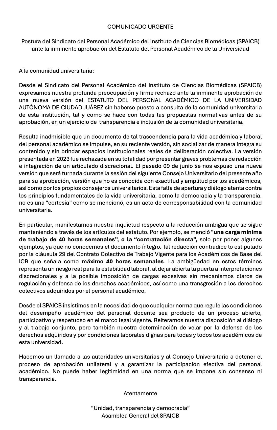 Ciudad Juárez.- El Sindicato del Personal Académico del Instituto de Ciencias Biomédicas (SPAICB) de la Universidad Autónoma de Ciudad Juárez (UACJ) denunció públicamente la inminente aprobación de un nuevo Estatuto del Personal Académico sin haber sido previamente consultado con la comunidad docente, lo que consideran una violación a los principios de transparencia y democracia universitaria.