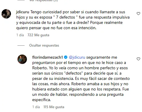 Ante la ola de críticas en redes sociales, Meza respondió directamente a uno de los comentarios en su cuenta de Instagram, aclarando que la frase fue una forma irónica de expresar cuánto admiraba a Roberto, al punto de creerlo perfecto.