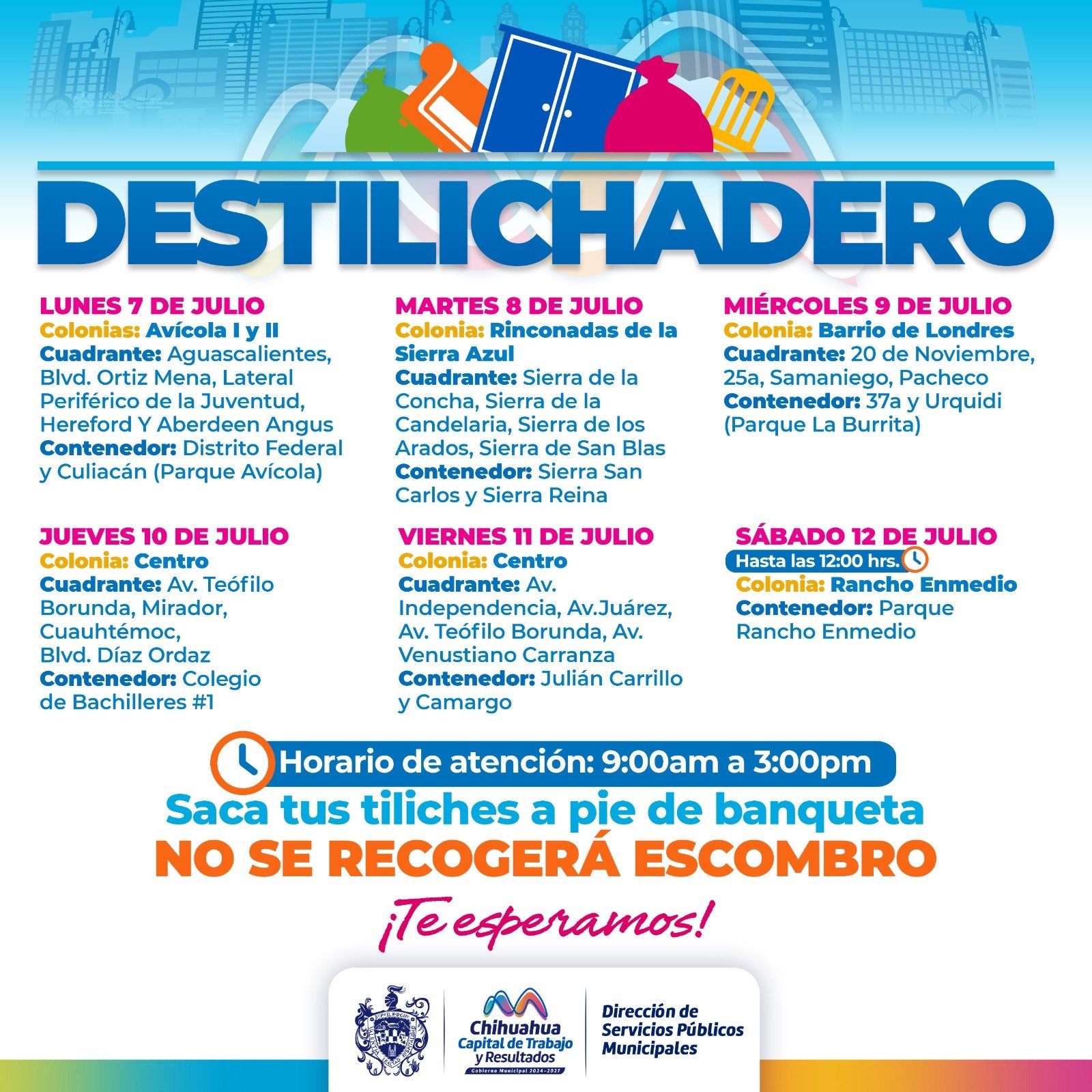 H. Cd de Chihuahua.– El Gobierno Municipal anunció que el programa Destilichadero estará visitando varias colonias del 7 al 12 de julio, para que las familias puedan tirar muebles viejos, colchones, llantas o tiliches grandes que no recoge el camión normal de basura.