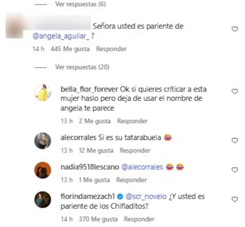 H. Cd. de Chihuahua.- Florinda Meza volvió a ser tema de conversación en redes sociales tras el estreno de la bioserie Chespirito: Sin querer queriendo. Algunos usuarios la han comparado con Ángela Aguilar, tanto por aspectos físicos como por similitudes en sus relaciones sentimentales. Ante esto, la actriz respondió con humor: “¿Y usted es pariente de Los Chifladitos?”, negando cualquier parentesco con la joven cantante.