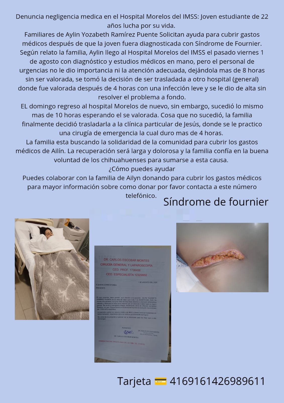 H. Cd de Chihuahua.- Jacqueline Puente Rodríguez busca desesperadamente apoyo económico para cubrir los gastos médicos de su hija Ailín, quien se encuentra internada en una clínica privada luego de que tres hospitales públicos le negaran atención efectiva a pesar de que presentaba síntomas graves de una infección tipo Founier.