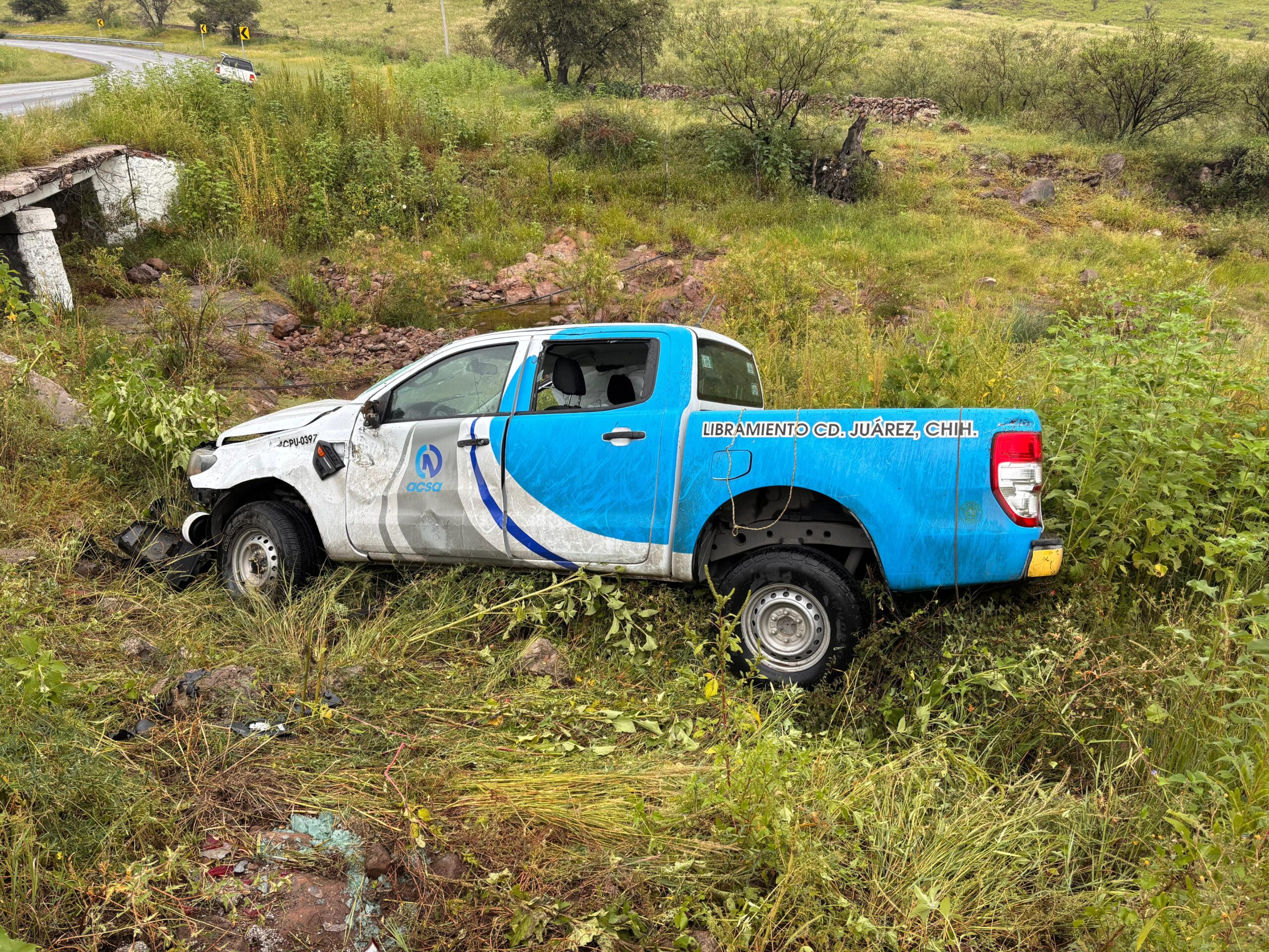 H. Cd de Chihuahua.- Un aparatoso accidente se registró este viernes en la carretera libre a Ciudad Juárez, a la altura de la zona conocida como Siete Cabecillas, donde una camioneta Ford Ranger terminó volcada dentro de un arroyo.