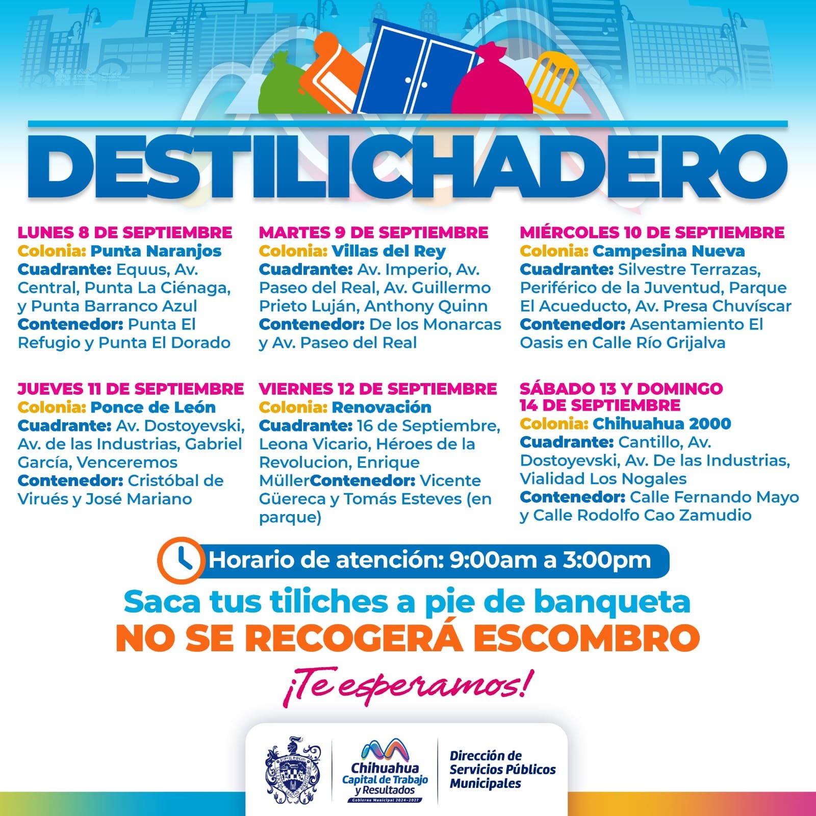 H. Cd de Chihuahua.- El Gobierno Municipal dio a conocer que del 8 al 14 de septiembre el programa Destilichadero estará presente en seis colonias de la Capital, con el fin de evitar acumulación de basura de grandes dimensiones que pueda derivar en plagas o problemas de salud.