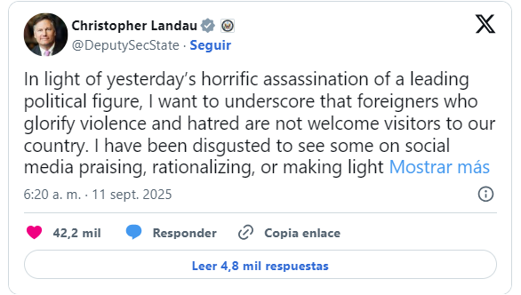 “Ante el horrible asesinato de ayer de una figura política destacada, quiero recalcar que los extranjeros que glorifican la violencia y el odio no son bienvenidos en nuestro país”, escribió el vicesecretario de Estado, Christopher Landau, en la red social X.