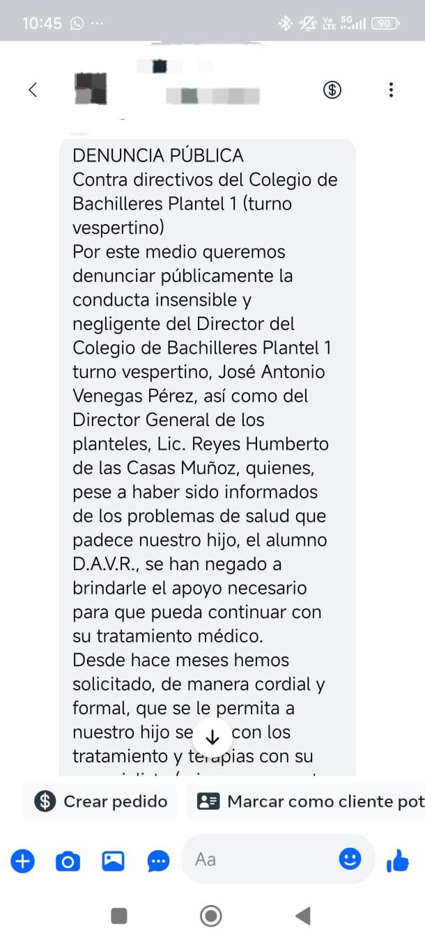 H. Cd de Chihuahua.- Por medio de las redes sociales de En Blanco y Negro.com.mx, padres de un alumno del Colegio de Bachilleres Plantel 1 turno vespertino denunciaron públicamente la conducta insensible y negligente de directivos y personal del plantel, quienes, según los padres, han obstaculizado que su hijo continúe con tratamientos médicos necesarios para su salud mental.