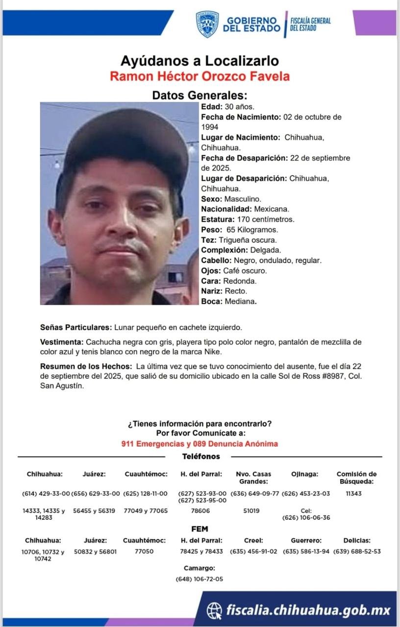 Buscan a Ramón Héctor Orozco Favela, desaparecido en Chihuahua 24 septiembre, 2025 No hay comentarios Leer más