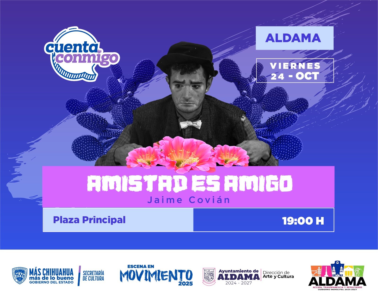 El 24 de octubre, Jaime Covian presentará la obra de teatro “Amistad es amigo”, en la Plaza Principal del municipio de Aldama a las 19:00 horas.