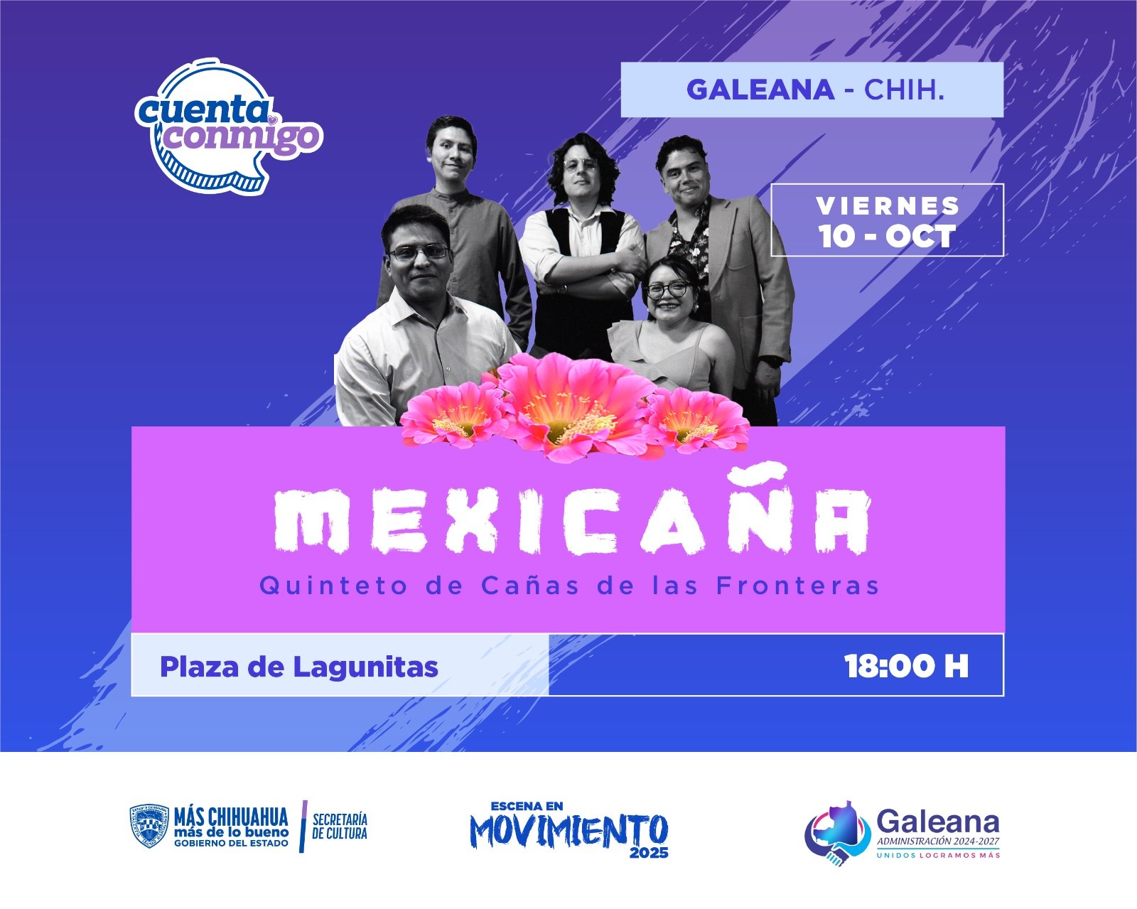 El día 10 de octubre continuarán en el municipio de Galeana, con el Quinteto de Cañas de las Fronteras, que amenizará la Plaza de Lagunitas con su concierto escénico “Mexicaña” a las 6 de la tarde.