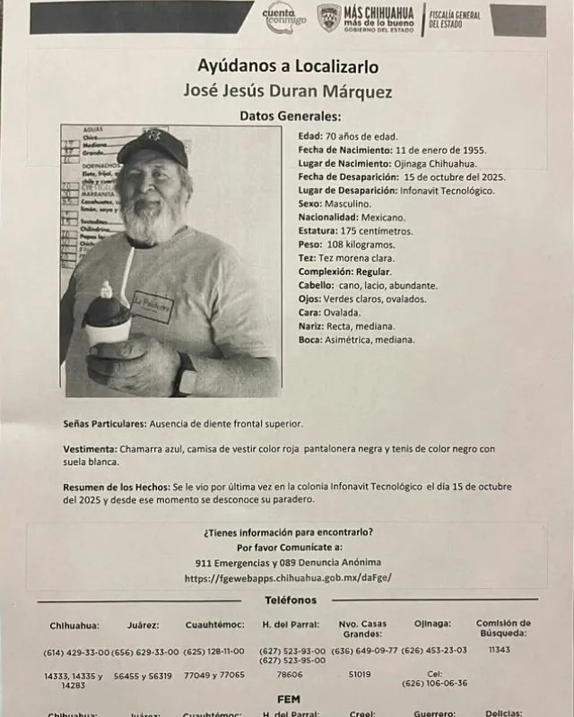 Ciudad Juárez.- La Fiscalía General del Estado y los familiares de José Jesús Durán Márquez, de 70 años, solicitaron el respaldo de la ciudadanía para dar con su paradero, tras desaparecer el pasado 15 de octubre en la colonia Infonavit Tecnológico. El adulto mayor fue visto por última vez caminando cerca del S-Mart del aeropuerto, rumbo a la avenida Tecnológico, sin portar identificación ni medicamentos.